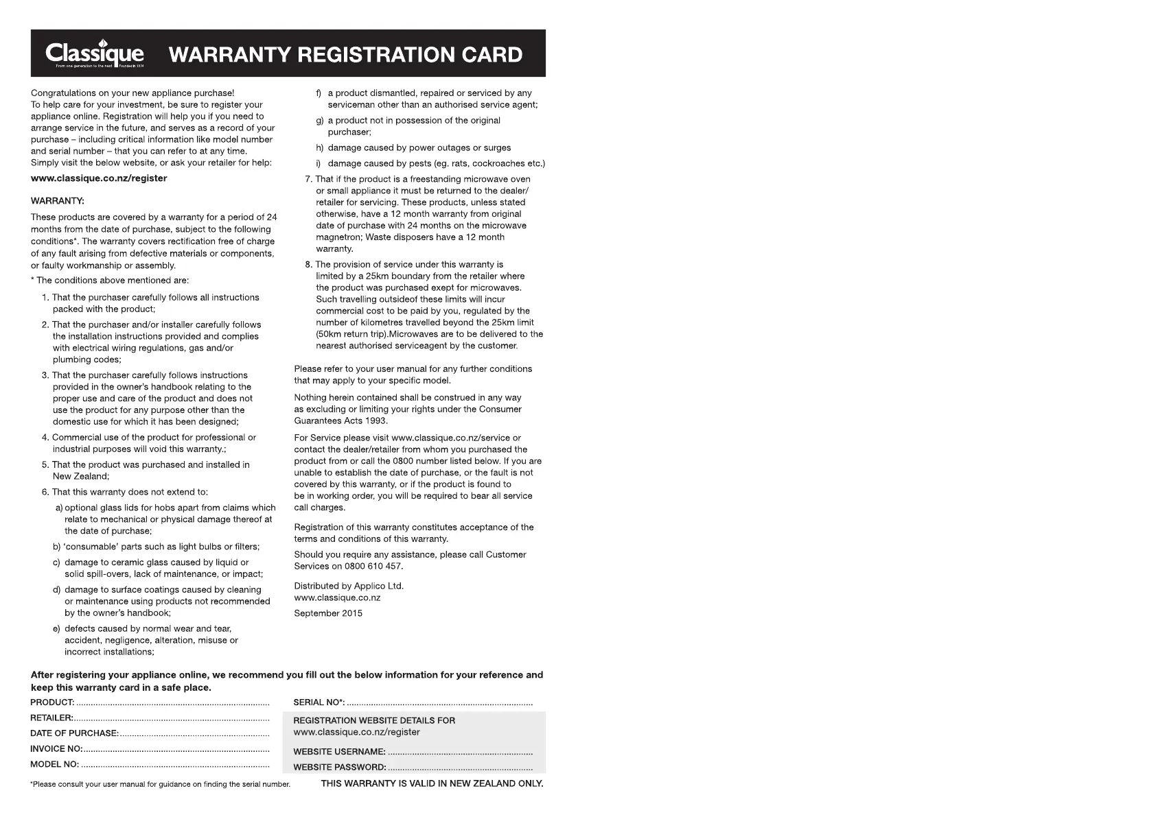 Classique CL7CDRY1 - Control Panel Overview; Warranty Registration; Warranty Terms and Conditions; Service and Support