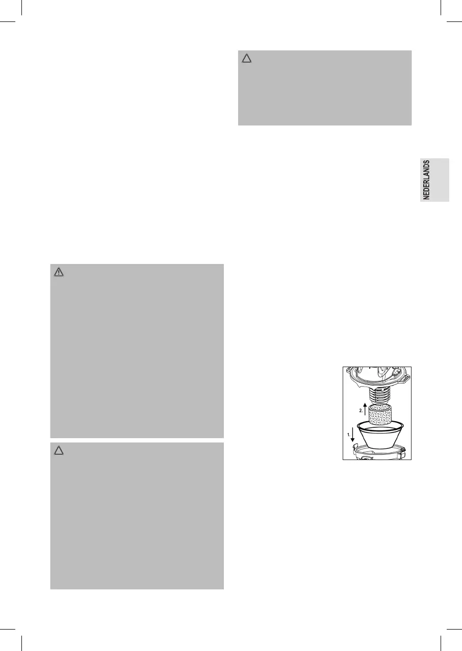 • Verwijder bij het opzuigen van vloeistoffen altijd het
