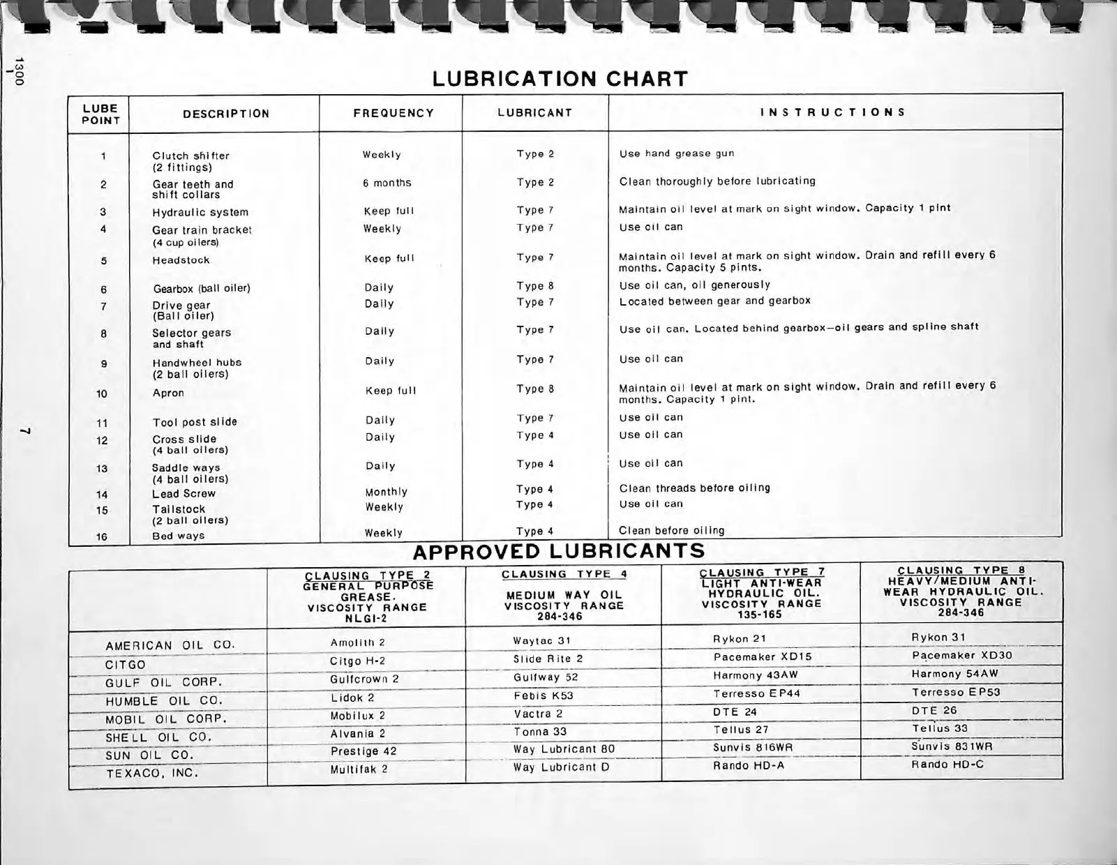 CLAUSING 1300 Series - Lubrication Chart; Approved Lubricants