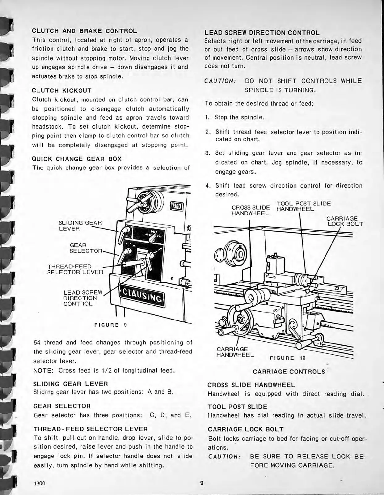 CLAUSING 1300 Series - Clutch and Brake Controls; Gear Box Controls; Lead Screw Control; Carriage Controls