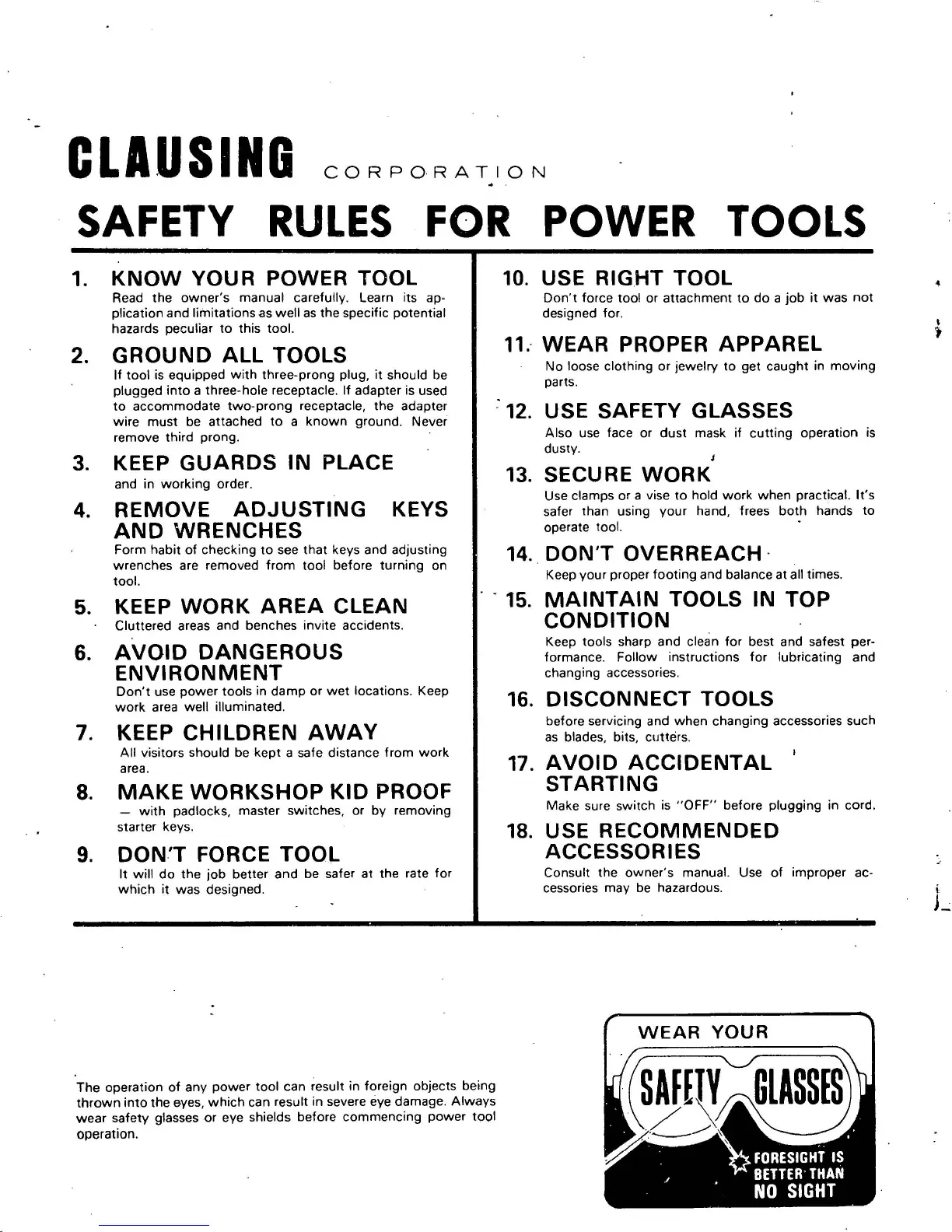 CLAUSING 1660 - SAFETY RULES FOR POWER TOOLS; KNOW YOUR POWER TOOL; GROUND ALL TOOLS; WEAR PROPER APPAREL
