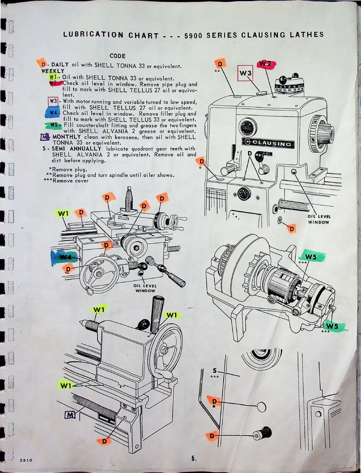 CLAUSING 5910 Series - Lubrication Chart for 5900 Series Lathes; Daily, Weekly, and Monthly Lubrication Tasks