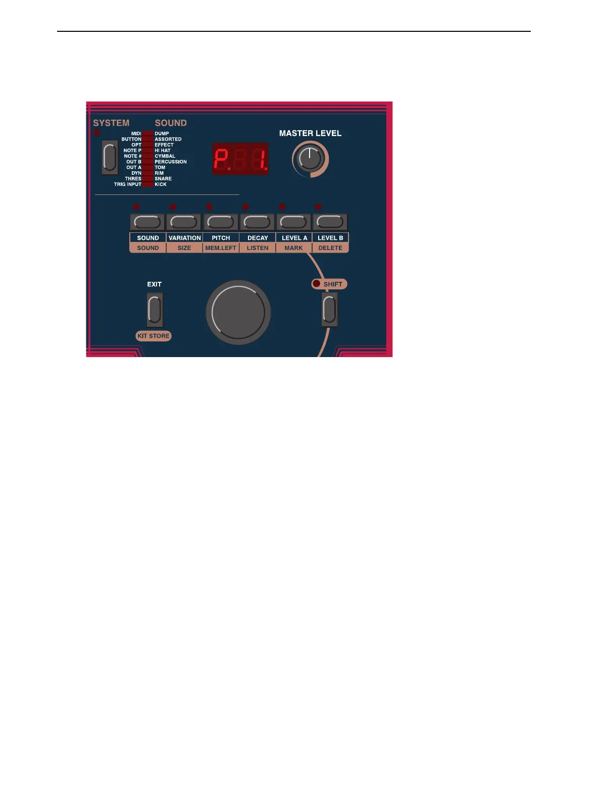 tons repeatedly to select different sounds from the four main channel groups, kick, snare, toms and per-