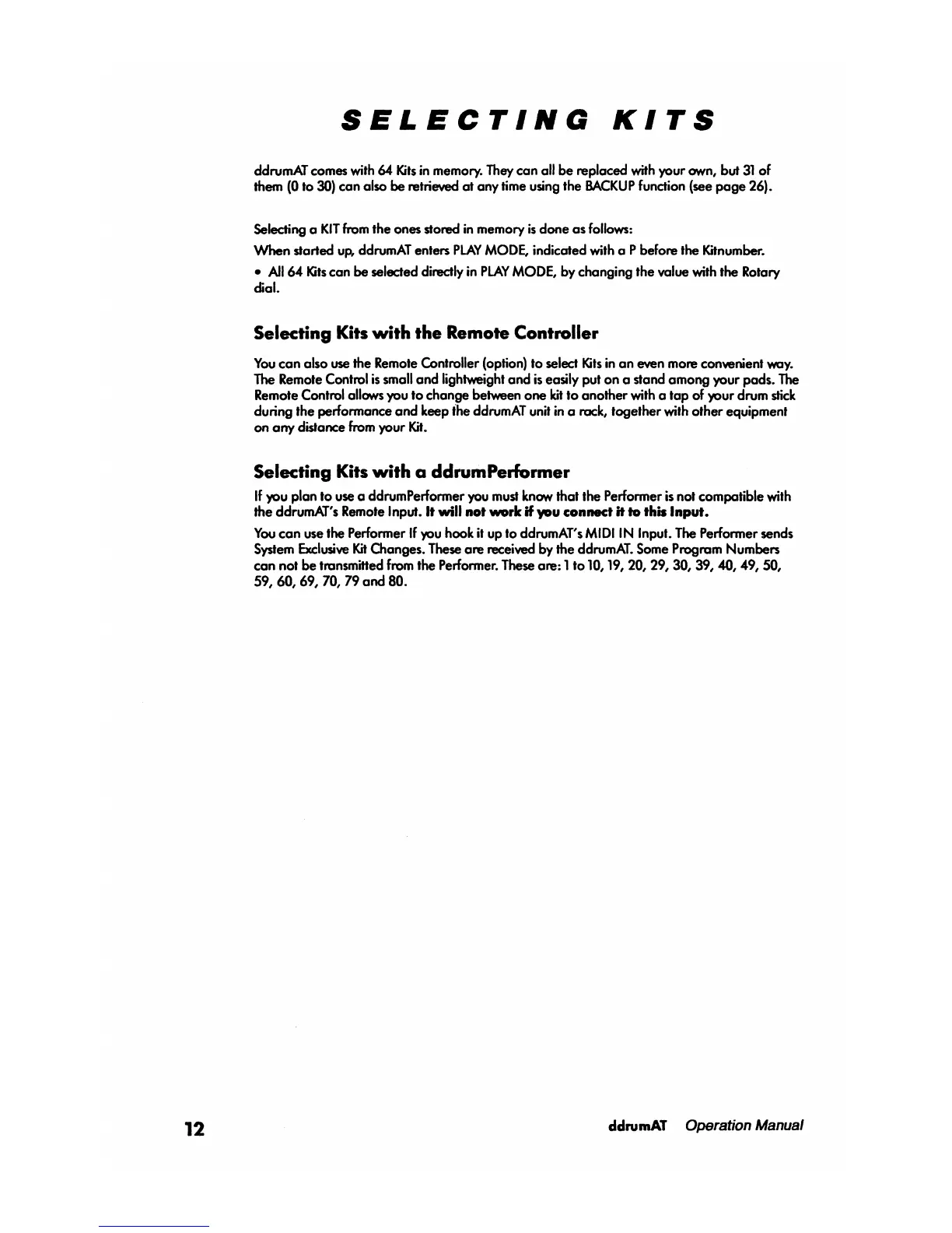 Clavia ddrumAT - Selecting Kits; Selecting Kits with the Remote Controller; Selecting Kits with a ddrumPerformer