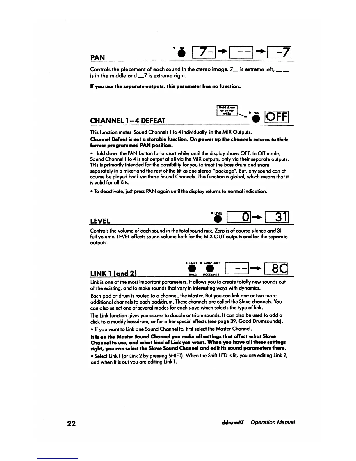 Clavia ddrumAT - The Sound Parameters; Pan; Channel 1-4 Defeat; Level