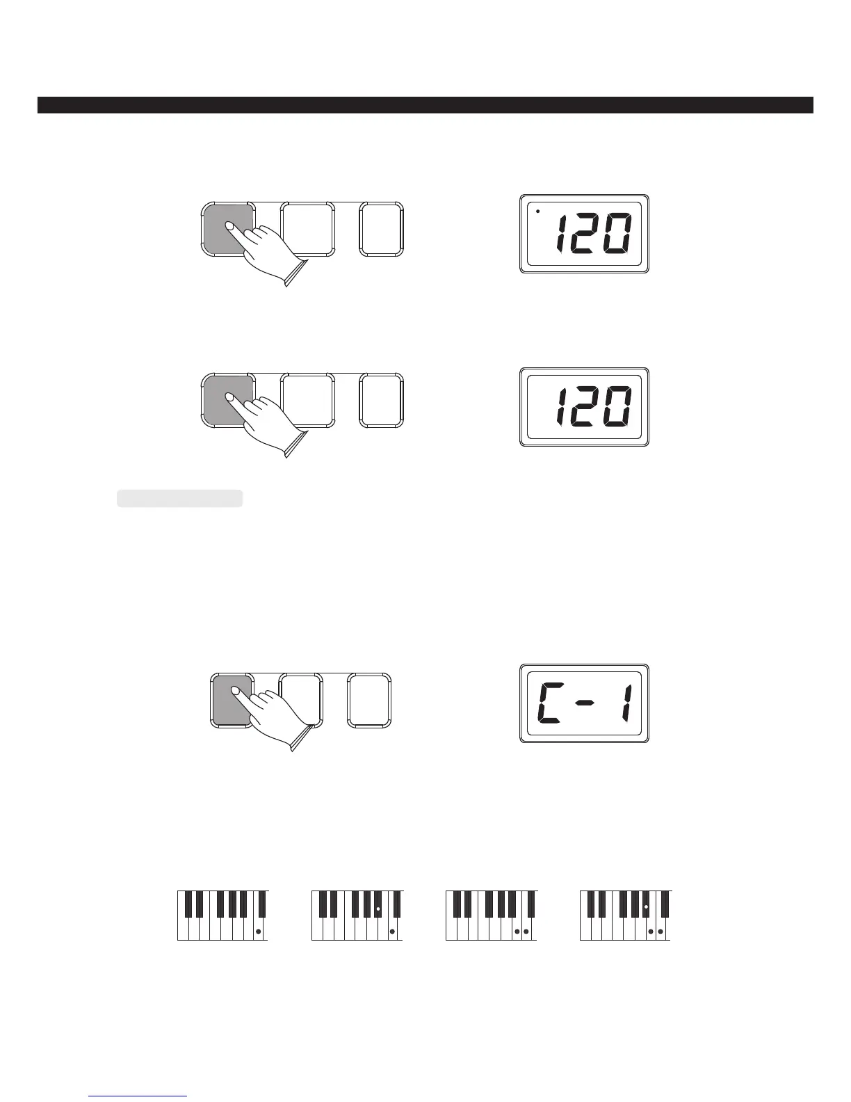 Minor chord:Simultaneously press the root key and a black key to its left