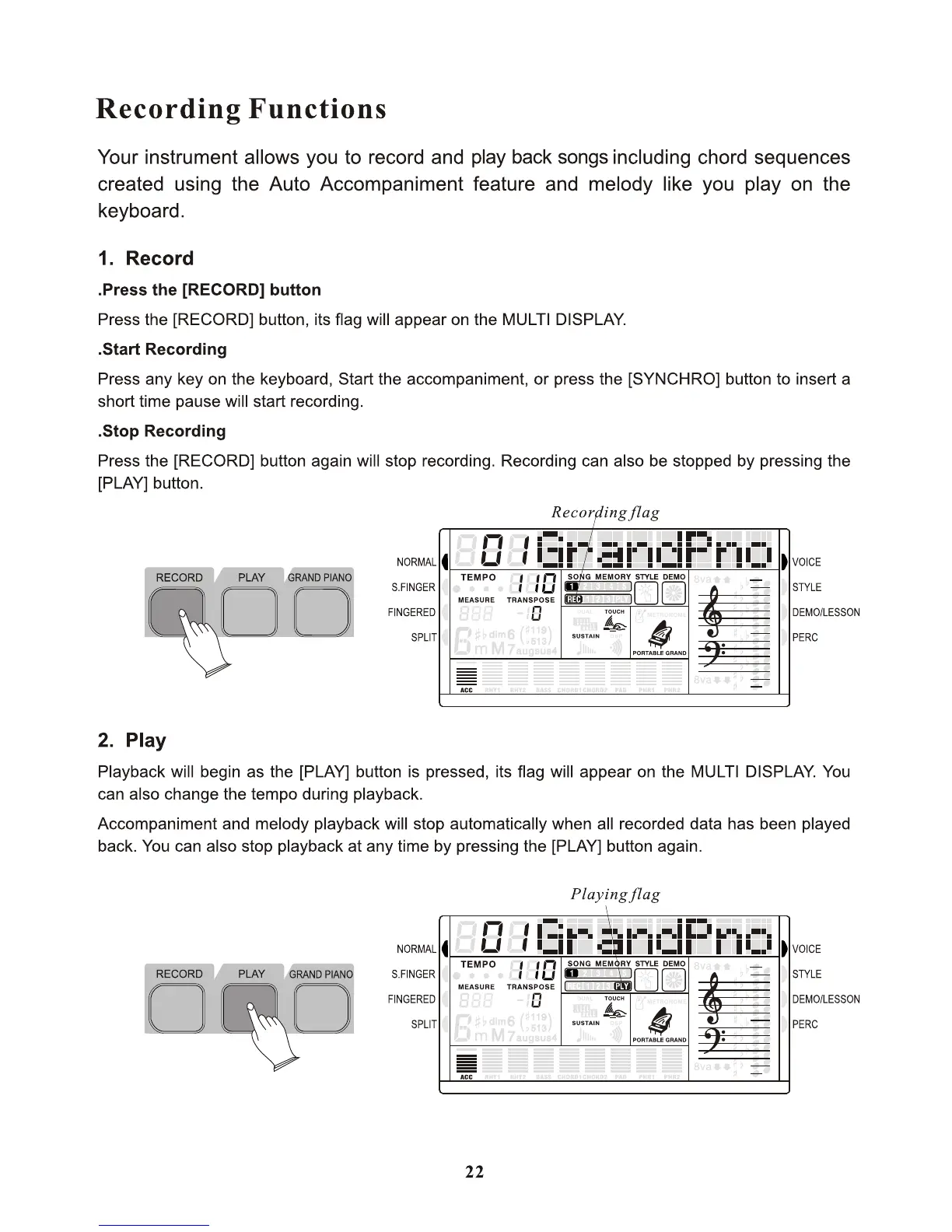 Clavitech TB800 - Recording Functions; Record Songs; Playback Recorded Songs
