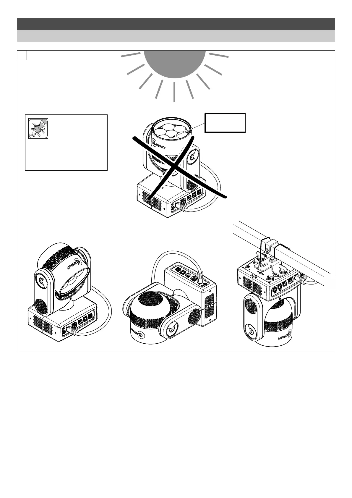 • To avoid damage to the internal parts of the fixture when the fixture is not working, is recommended to turn the head down before turning the fixture