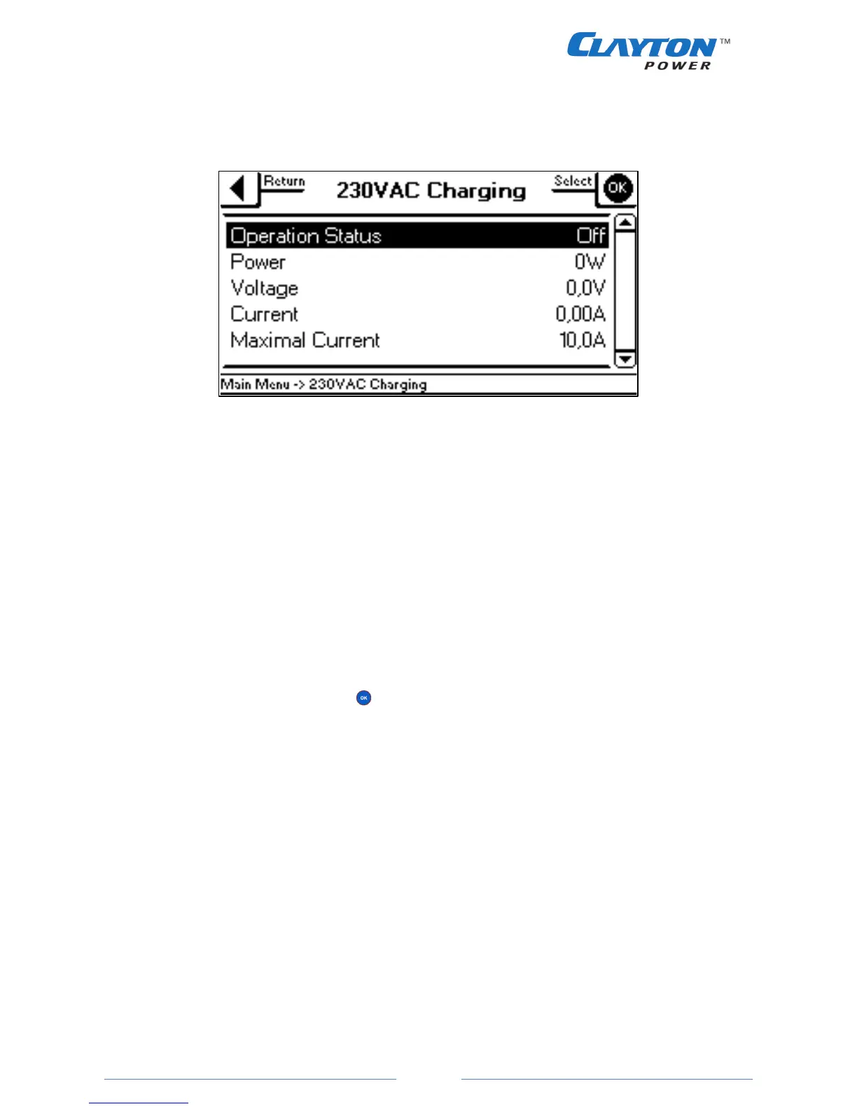 In the 230VAC Charging menu it is possible to get details about:
