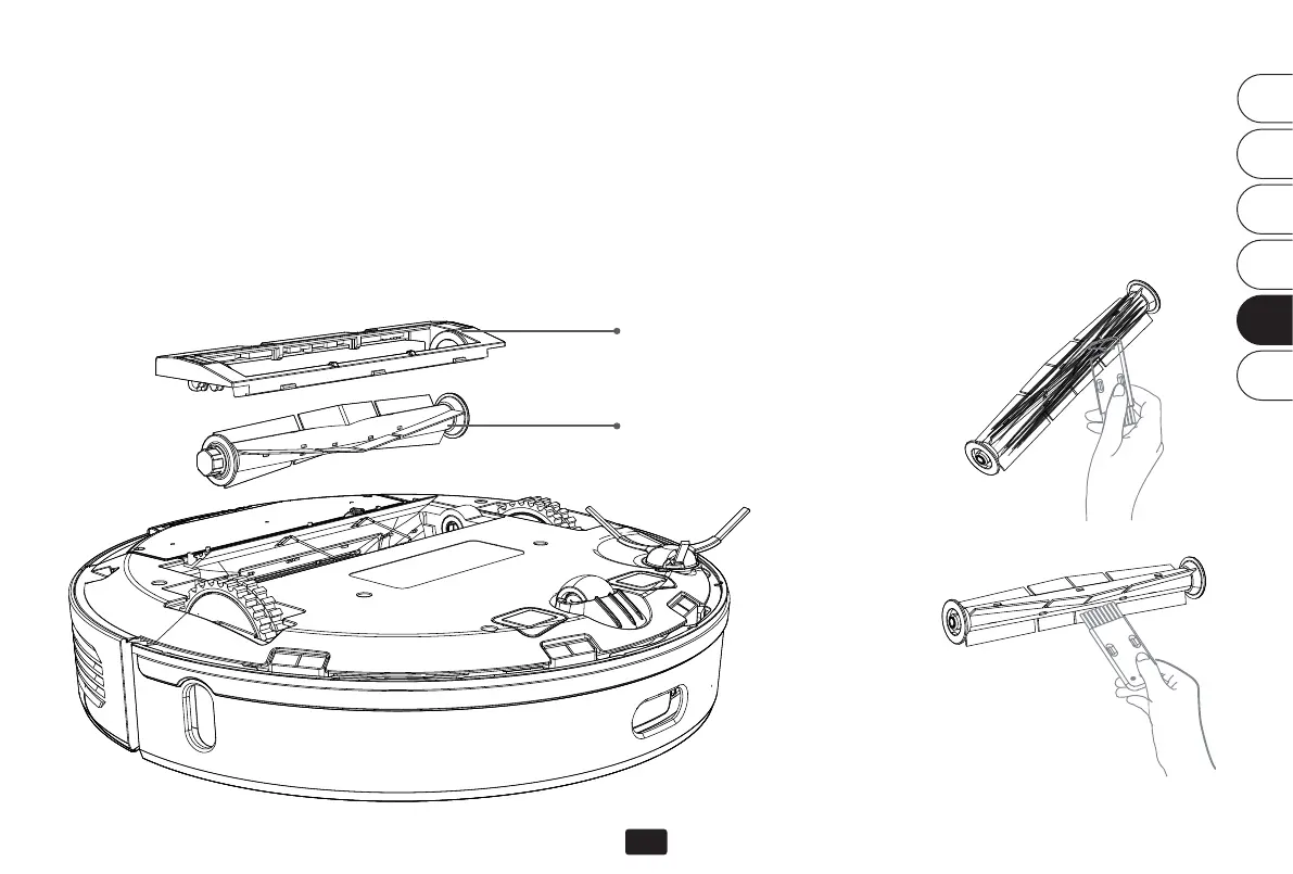 Gire el robot aspirador, presione los clips de ijación hacia la izquierda y la derecha y retire la cubierta del cepillo de rodillo.