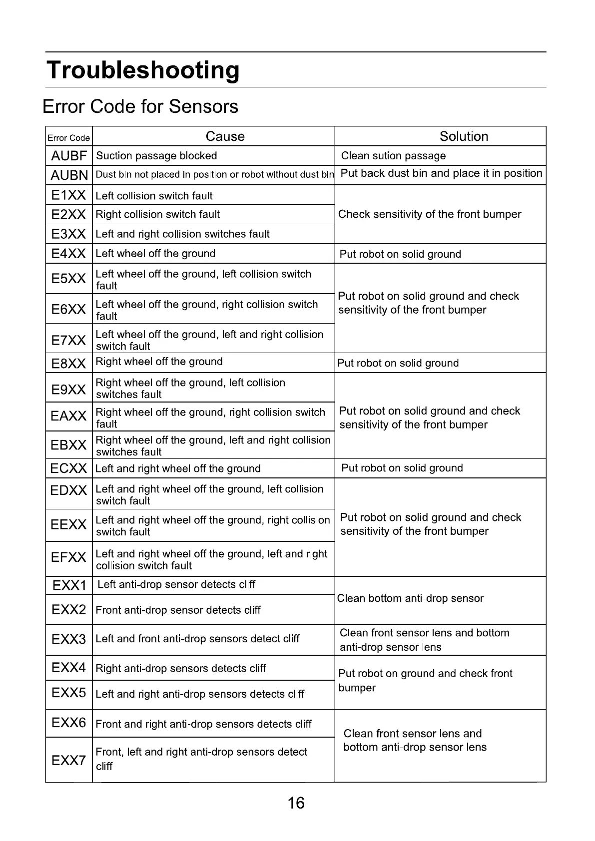 Cleanmate S 850 - Troubleshooting; Error Code for Sensors