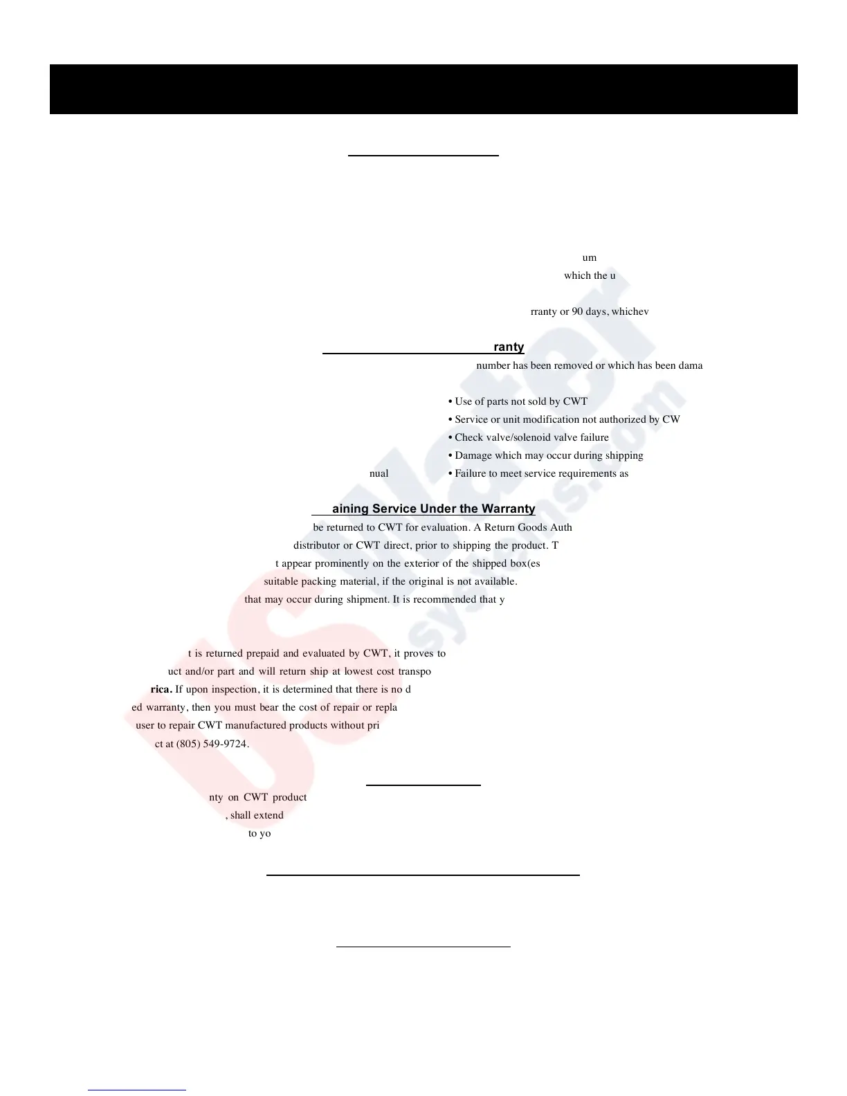 attempt by the end user to repair CWT manufactured products without prior permission shall void any and all warranties. For service, contact your authorized dealer or