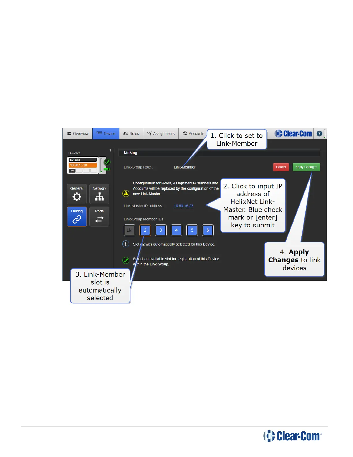 4. Set Link-Group Role of LQ unit to Link-Member. Navigate to Device/Linking/Link-Group