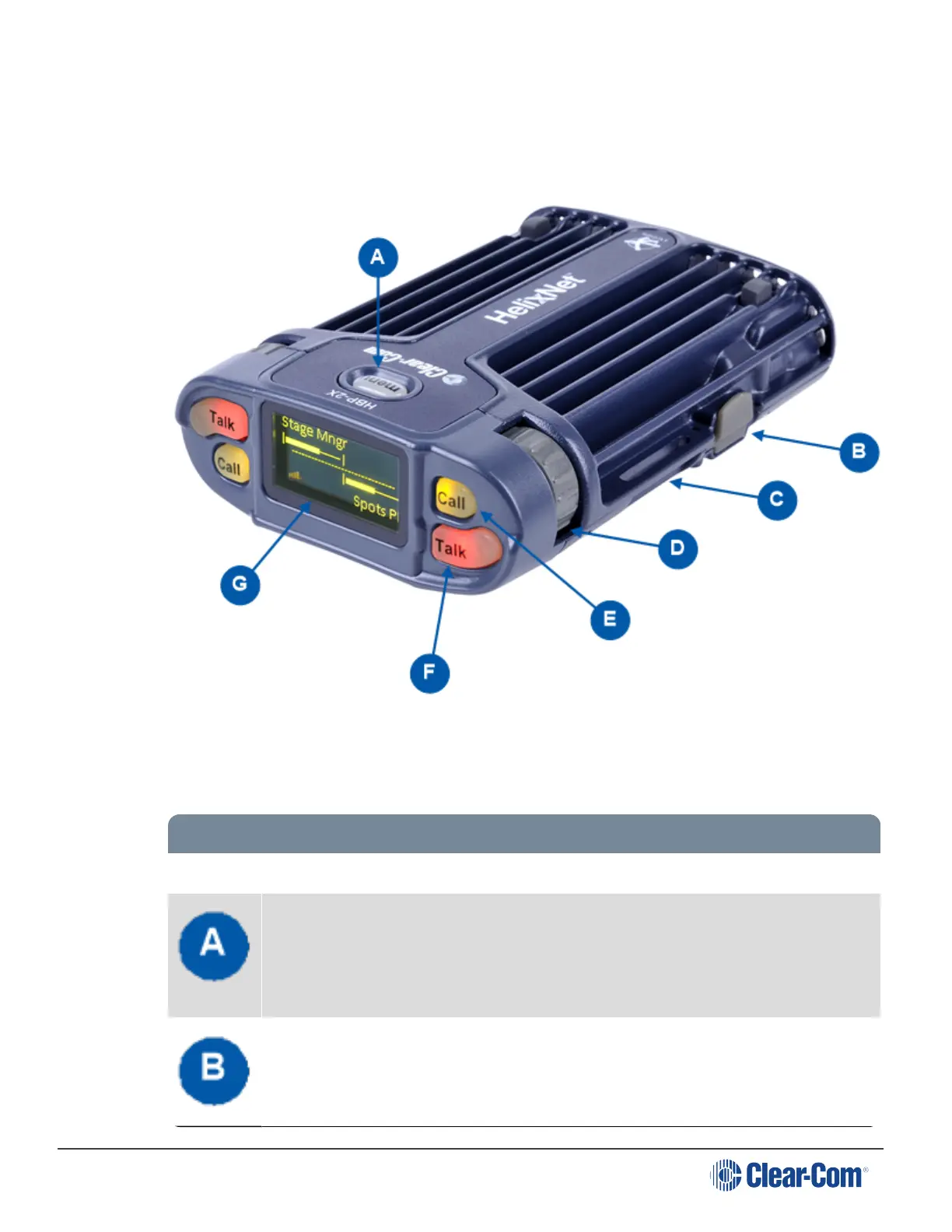 Note: The beltpack has two Keysets, each containing one Call button (E) and one Talk button