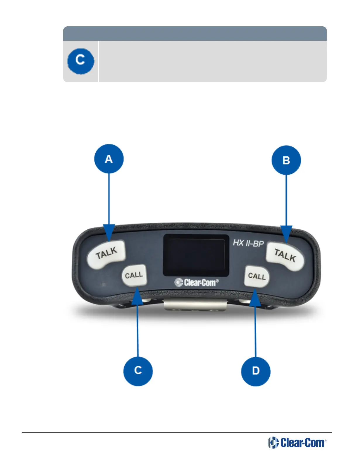 Note: The beltpack has two Keysets, each containing one Call button (C and D) and one