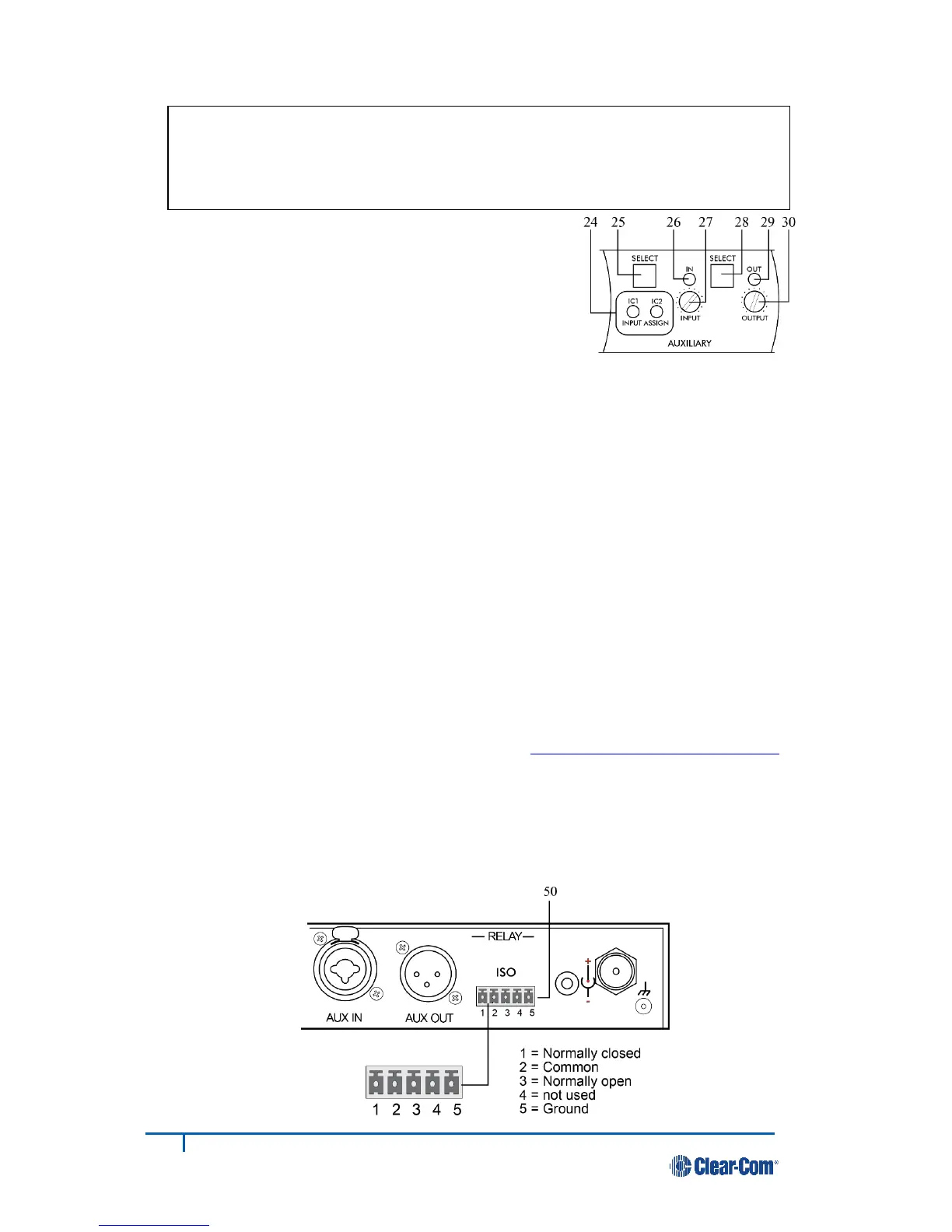 connected to the base station), AUX OUT (audio to the auxiliary equipment from the ISO channel of the