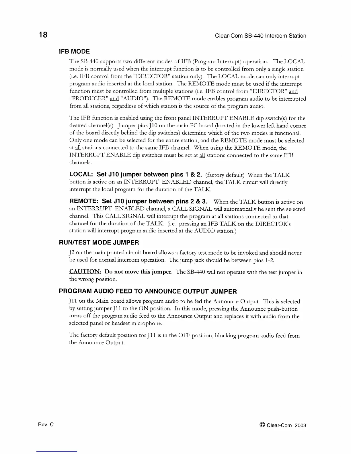 Clear-Com SB-440 - INTERNAL OPTIONS AND ADJUSTMENTS; IFB and Program Audio Modes