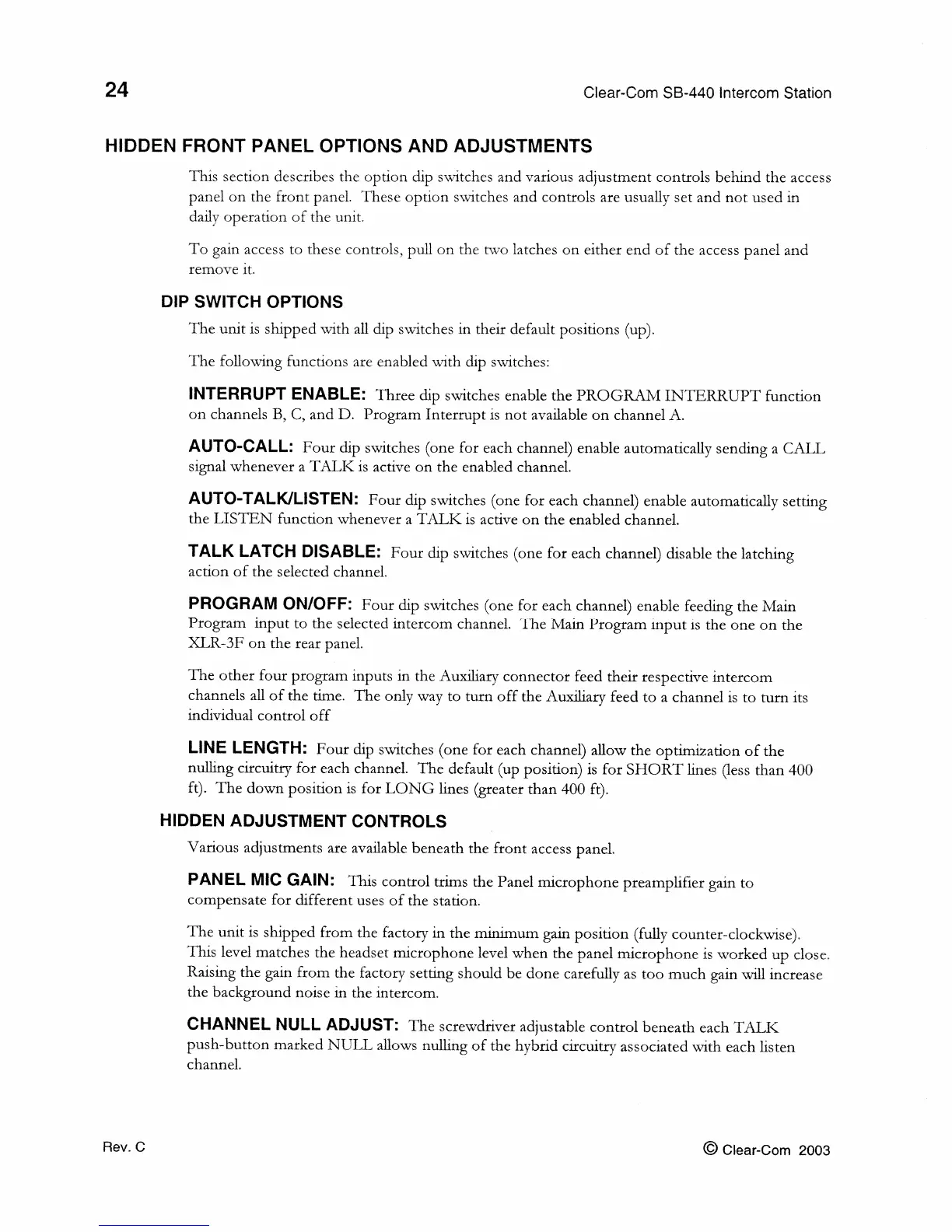 Clear-Com SB-440 - HIDDEN FRONT PANEL OPTIONS AND ADJUSTMENTS; Dip Switch Functions; Hidden Adjustment Controls
