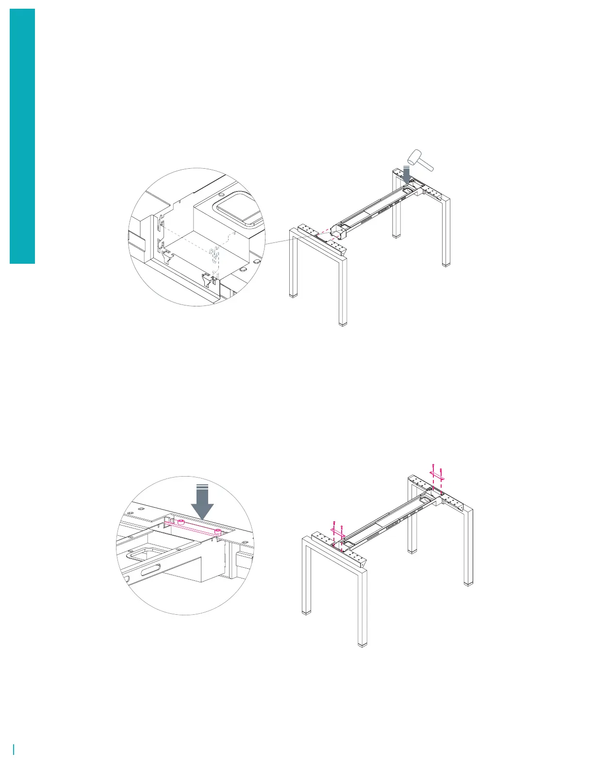 Insert beam tabs into leg brackets. Guide beam tabs into bracket holes,