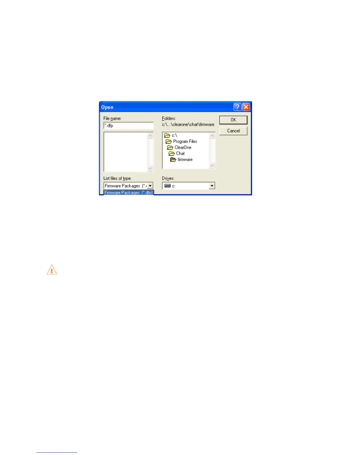 Press the 1. Select File button in the Update Firmware screen. The Open dialog window is displayed.