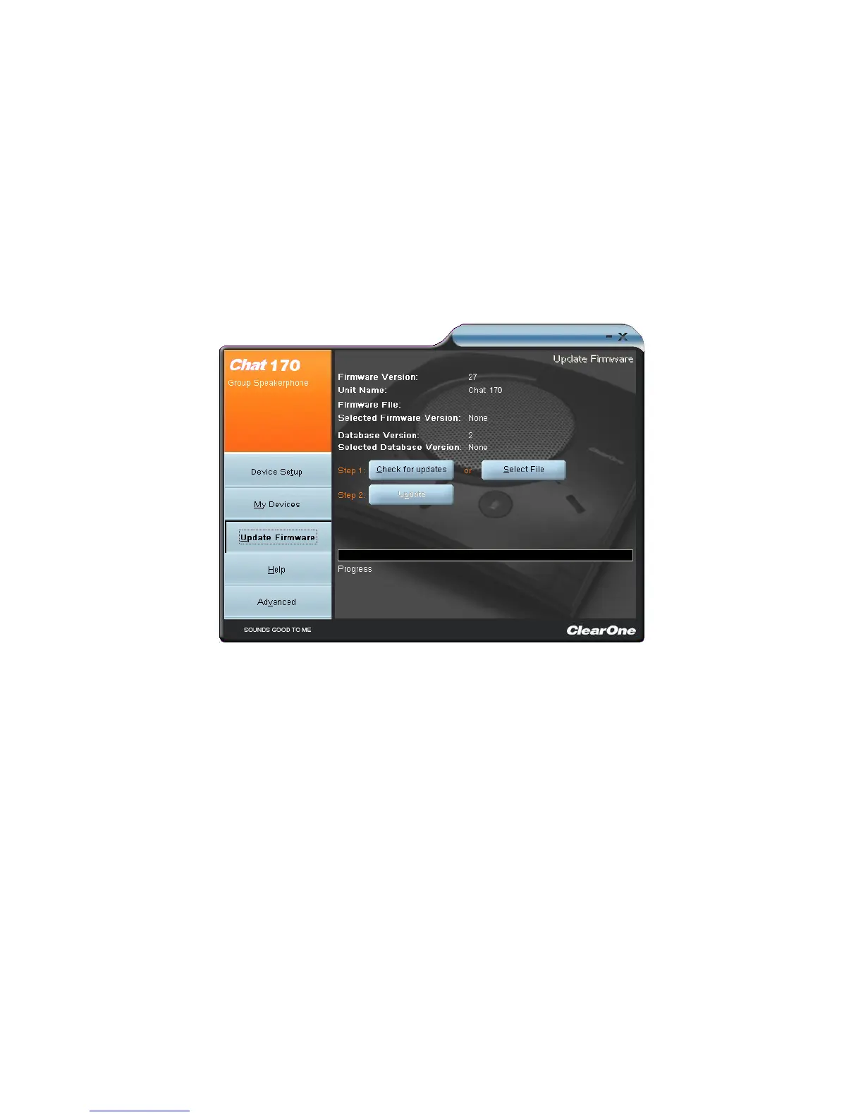 The Update Firmware screen displays the current firmware version, unit name, and checks ClearOne’s website for