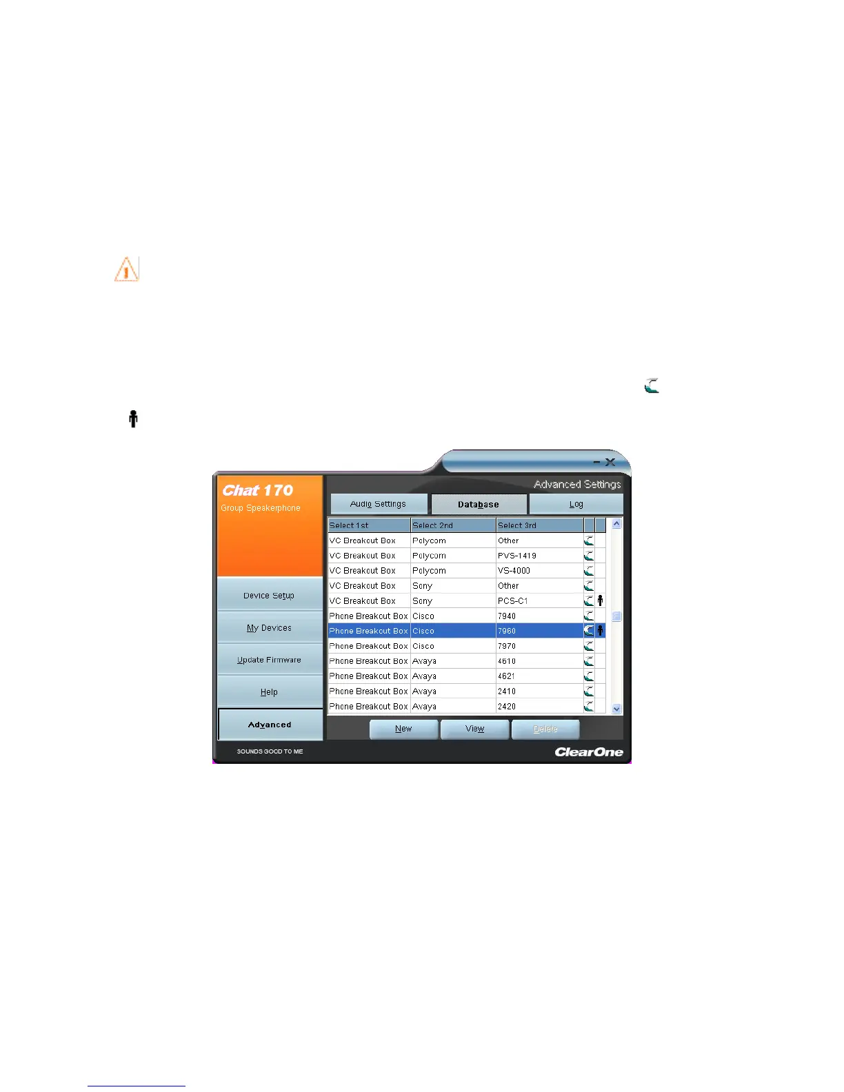 Database displays the devices configured for the CHAT 170 and allows you to edit them. The CHAT 170 device data-