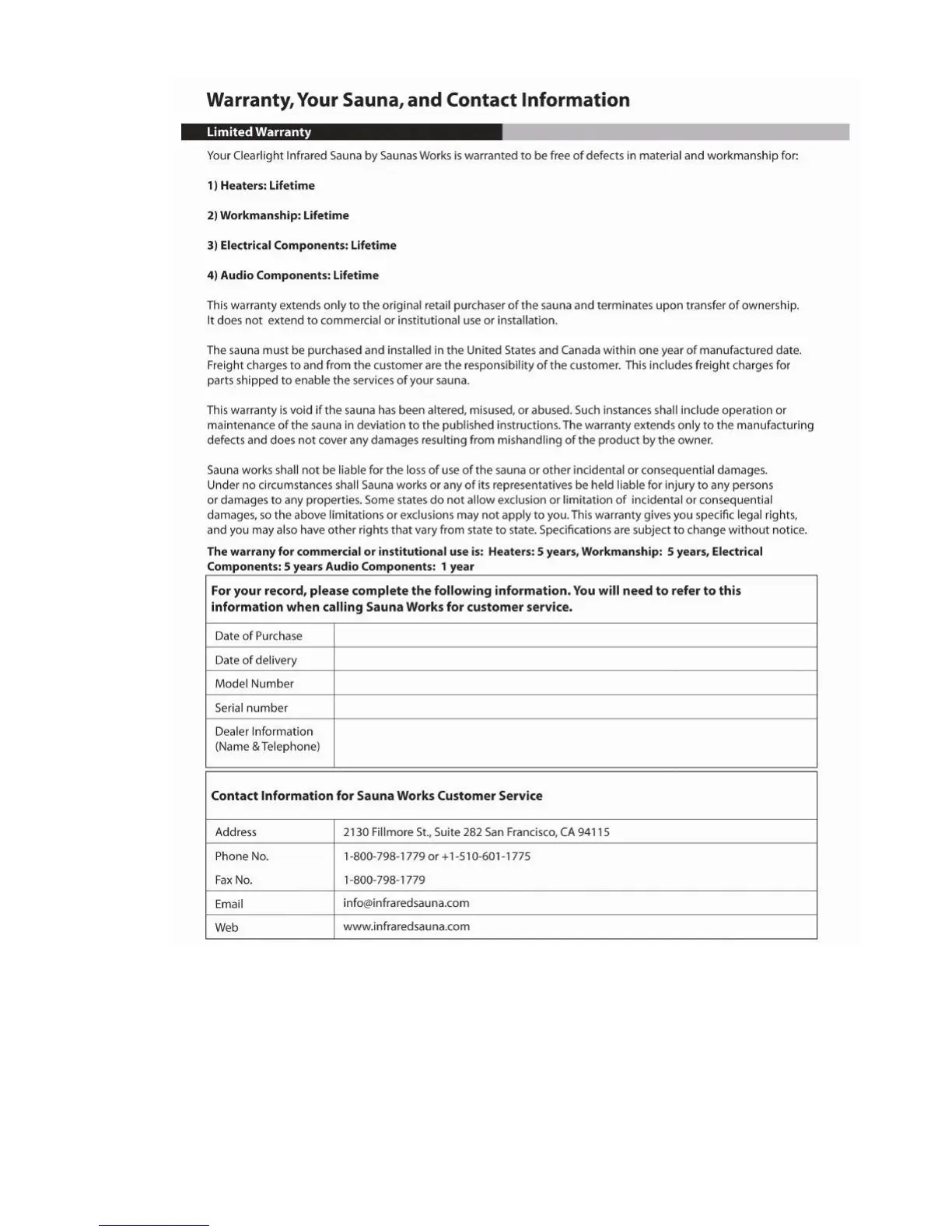 Clearlight CE-2 - Warranty, Your Sauna, and Contact Information; Limited Warranty; Contact Information