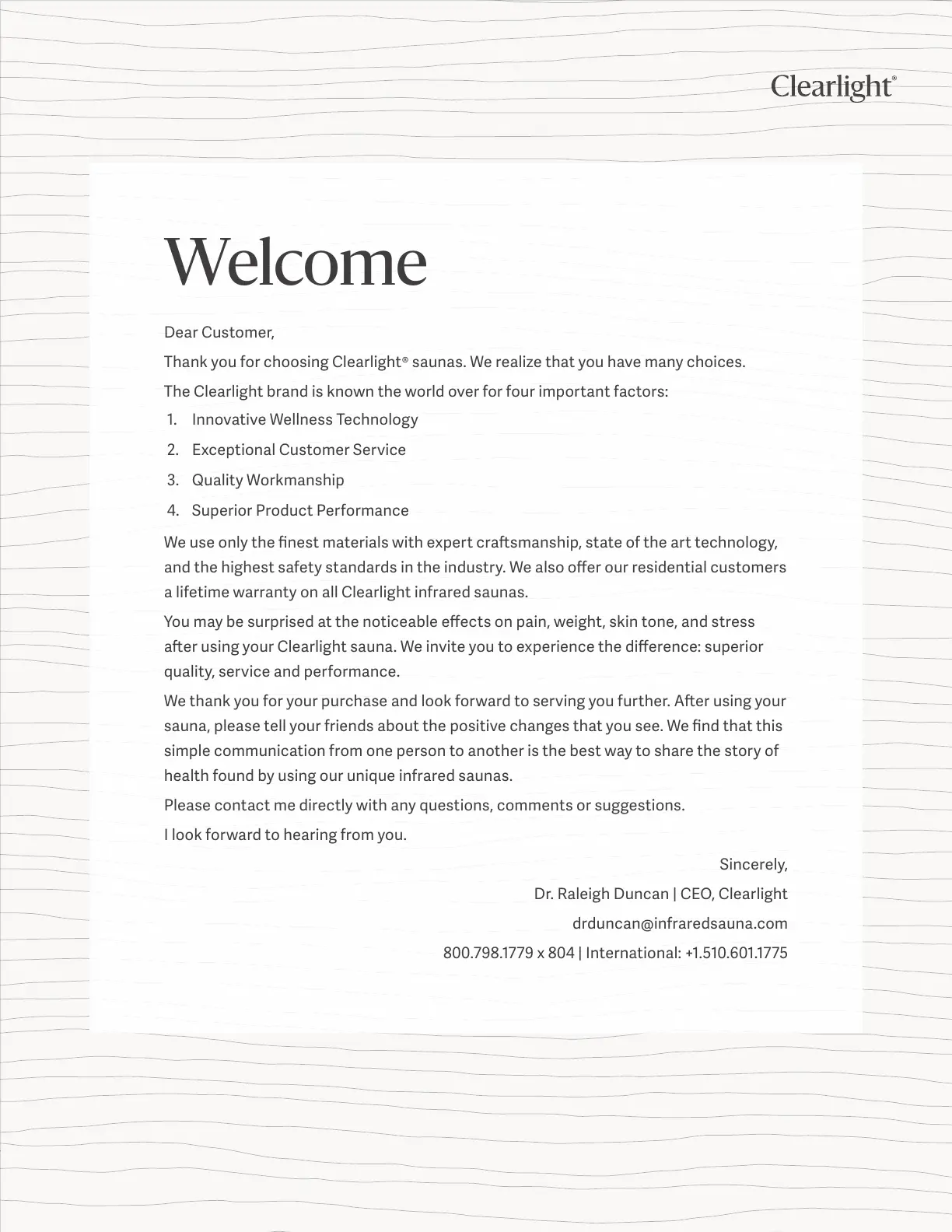 Thank you for choosing Clearlight® saunas. We realize that you have many choices.