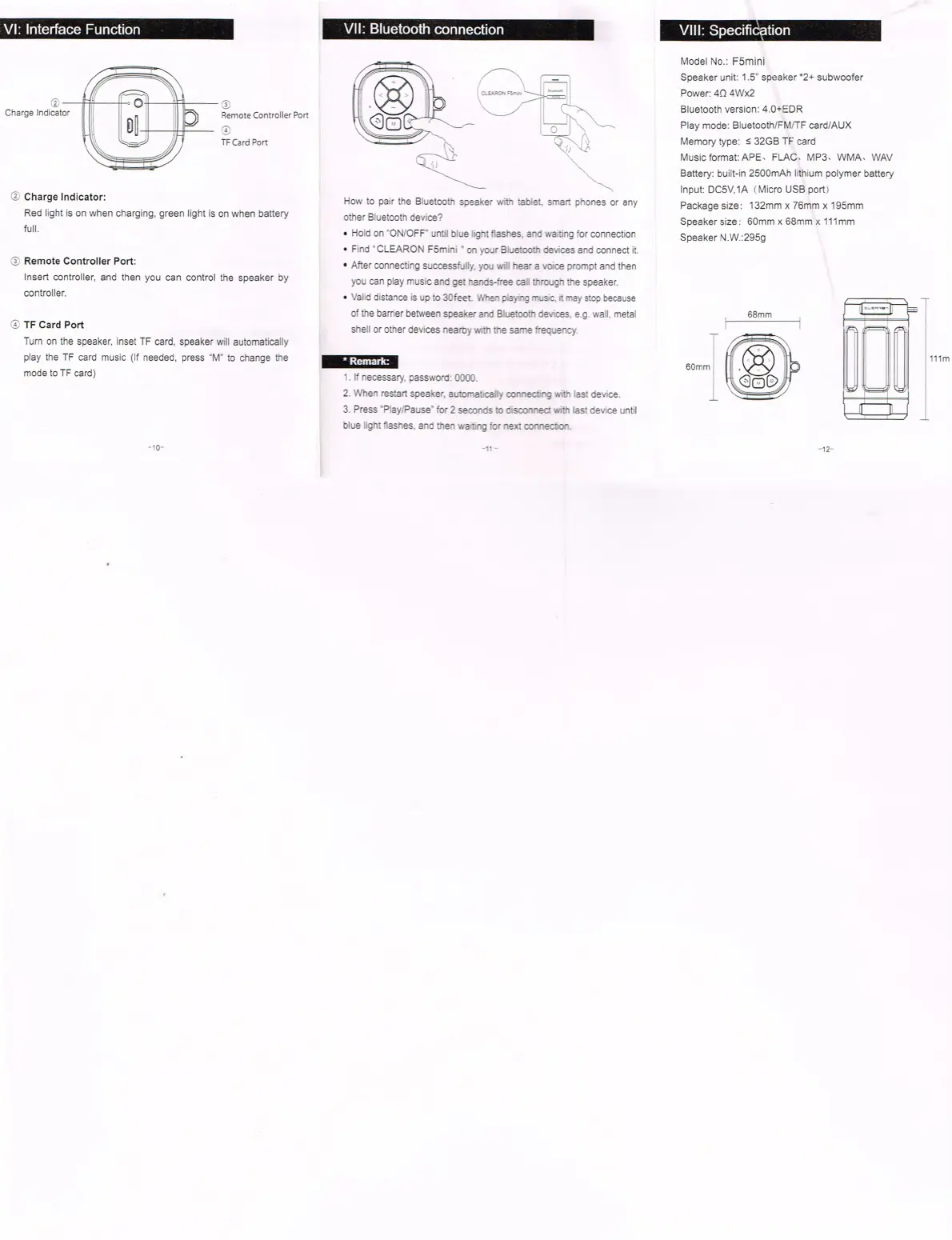 Play mode: Bluetooth/FM/TF card/AUX