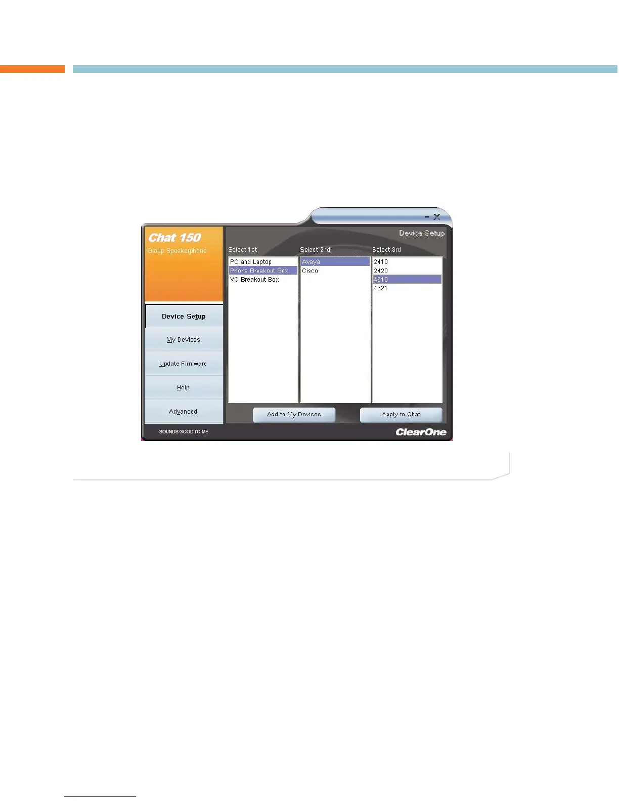 Device Setup configures the Chat 150 for use with specific devices to ensure optimal sound quality. To