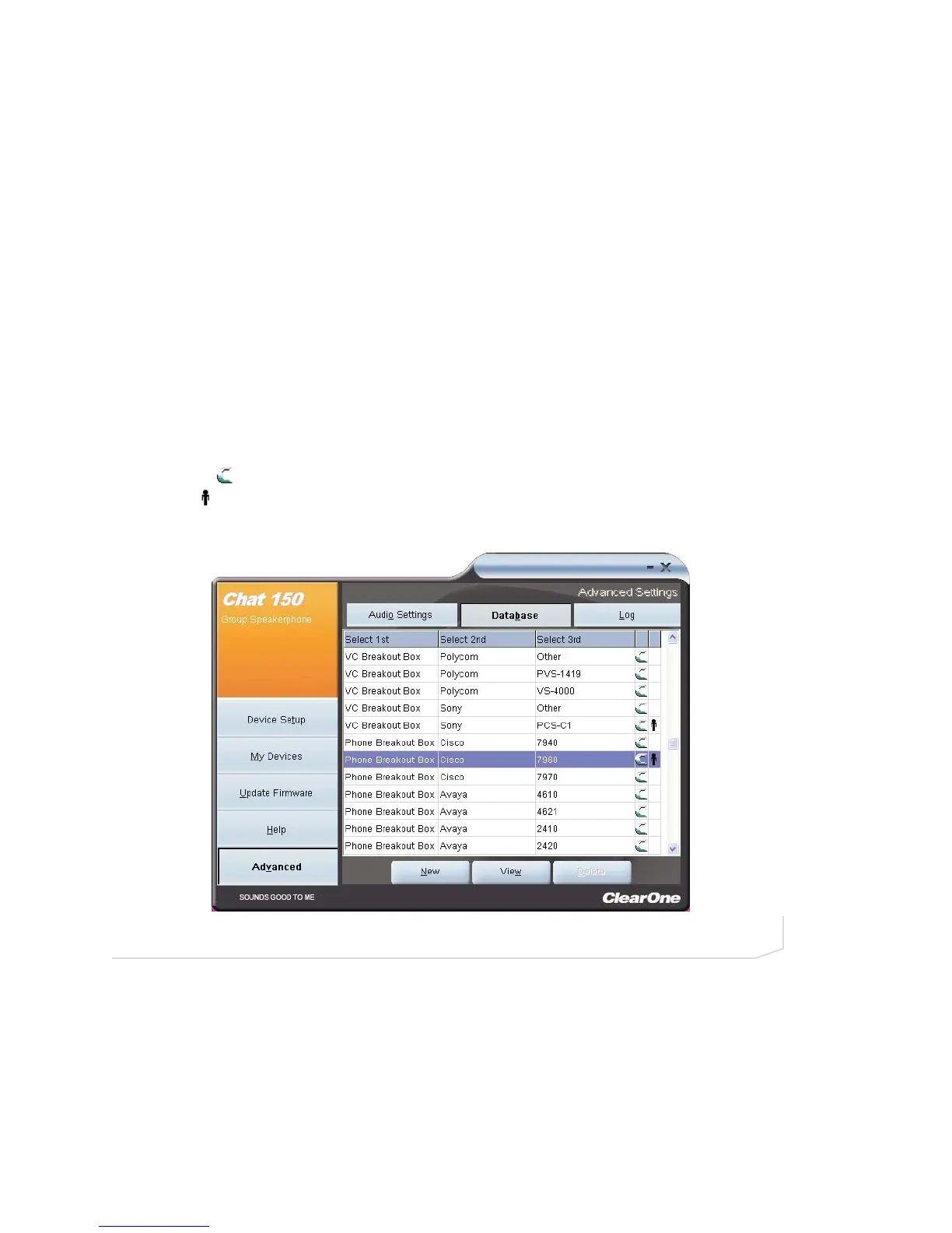 Chat 150 device database includes all of the audio settings for the devices pre-programmed by ClearOne