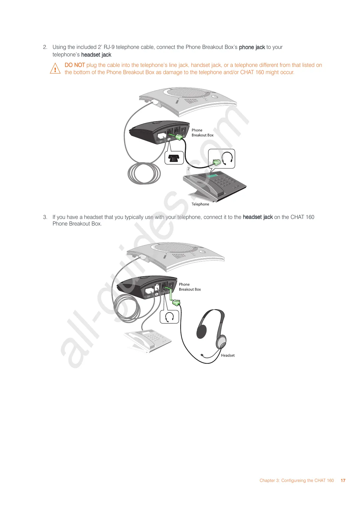 the bottom of the Phone Breakout Box as damage to the telephone and/or CHAT 160 might occur.