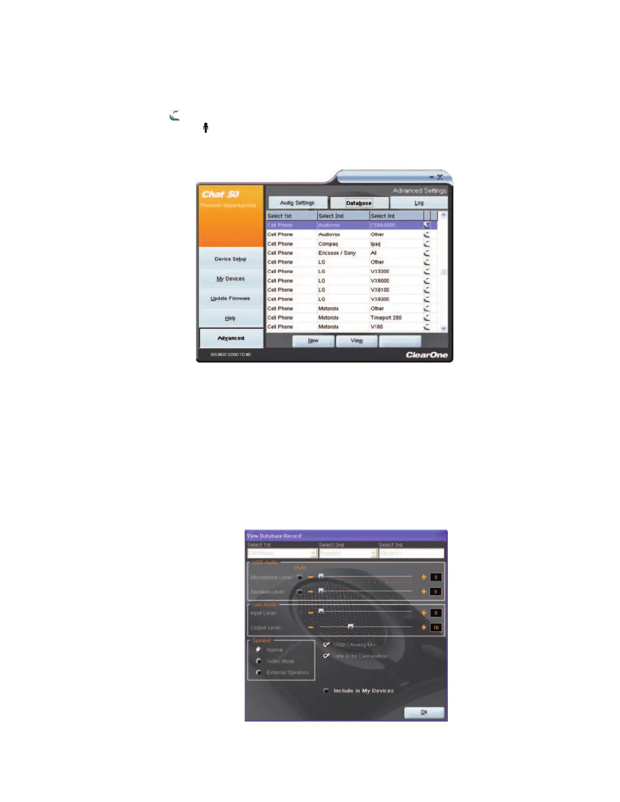 The database includes pre-defined devices with optimal audio settings pre-programmed by ClearOne