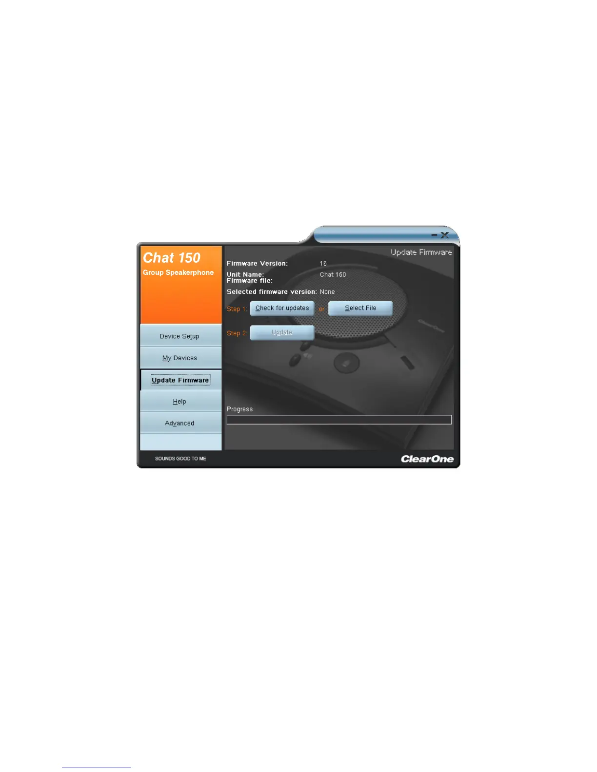 The Update Firmware screen displays the current firmware version, unit name, and checks ClearOne’s website for
