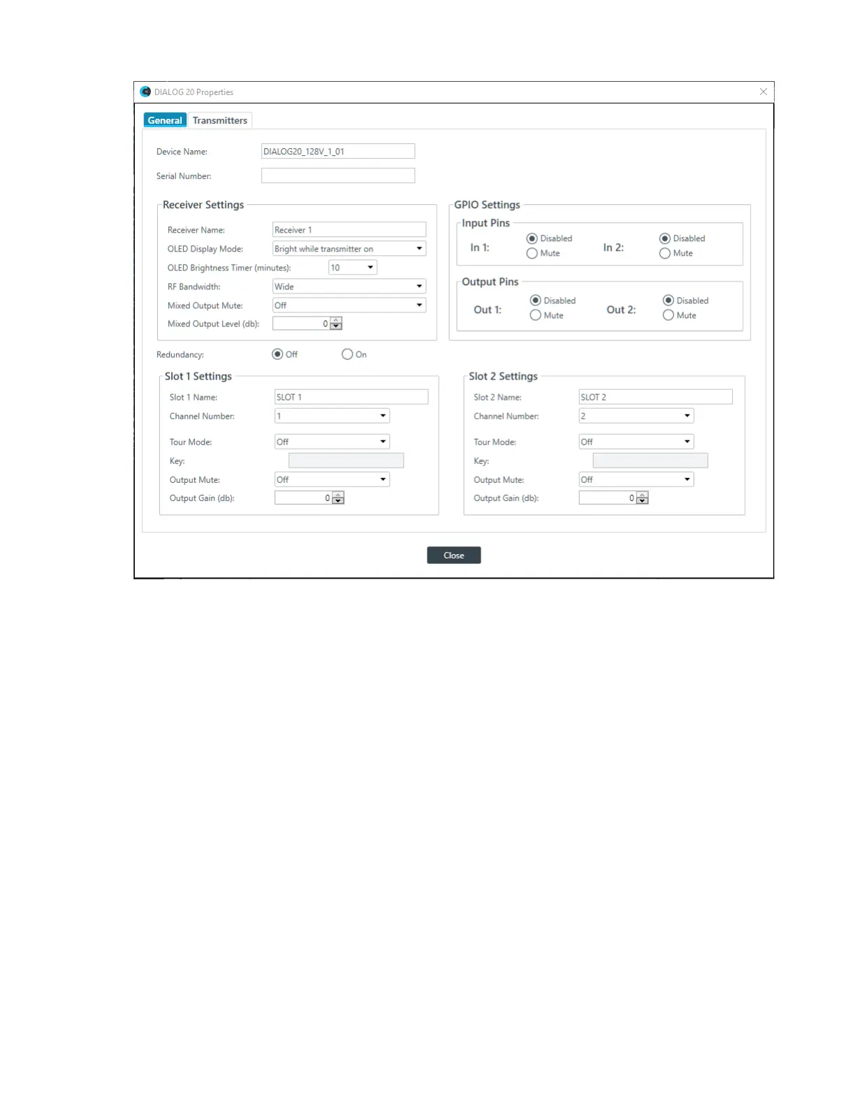 Serial Number The serial number of the DIALOG 20 device. If the device is