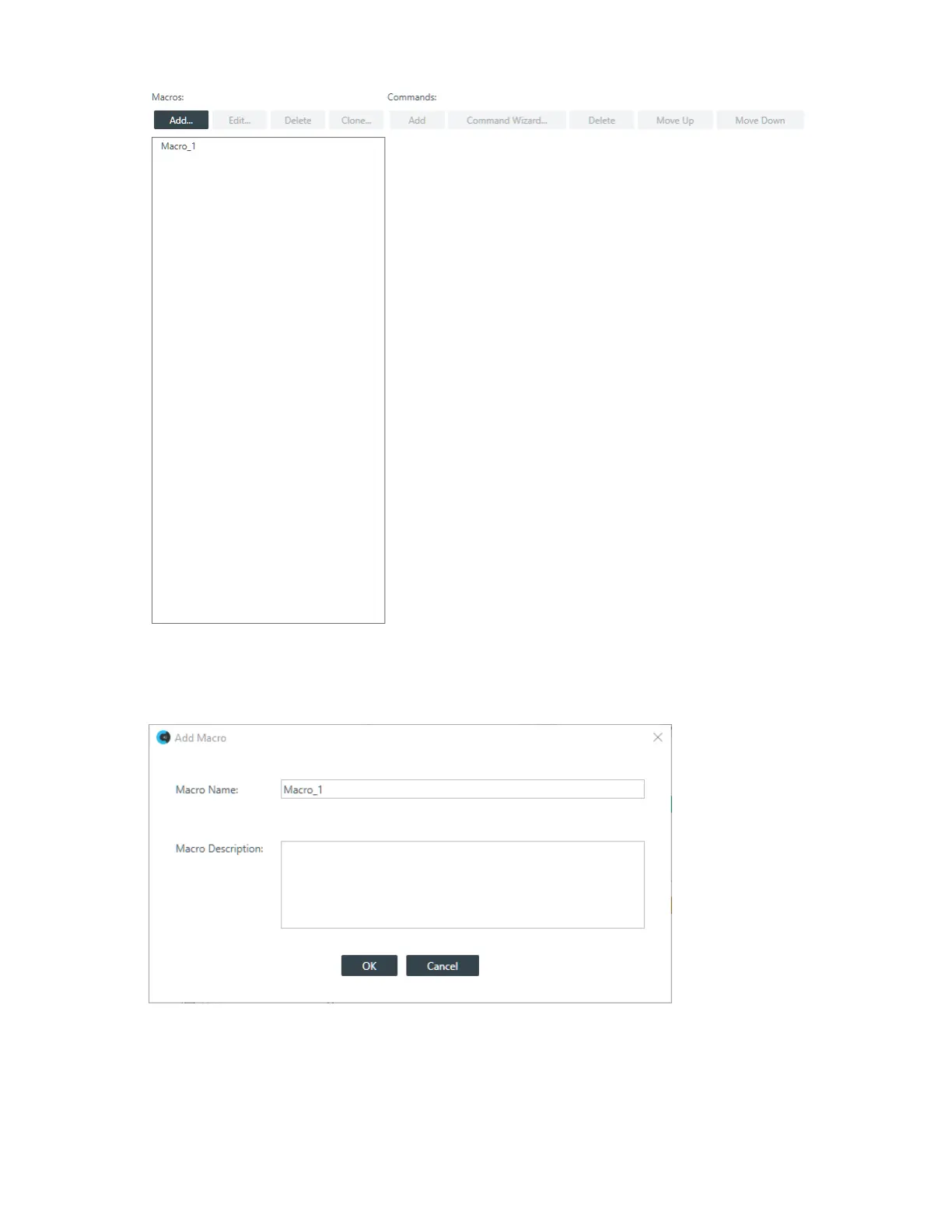 A macro with the name you specified is created in the Macros column, and an empty command is