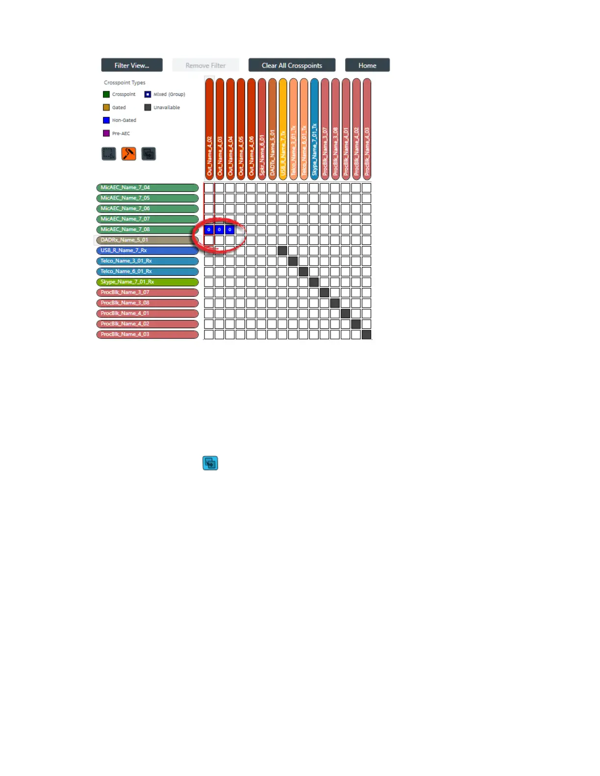 Notice that the crosspoints in the MicAEC_Name_7_08 channel row have been changed from “Gated”