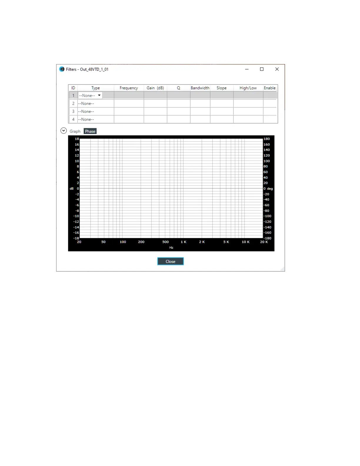 Selectable frequency cutoff is 20.00Hz to 20.00kHz. Rolloff is 12dB/