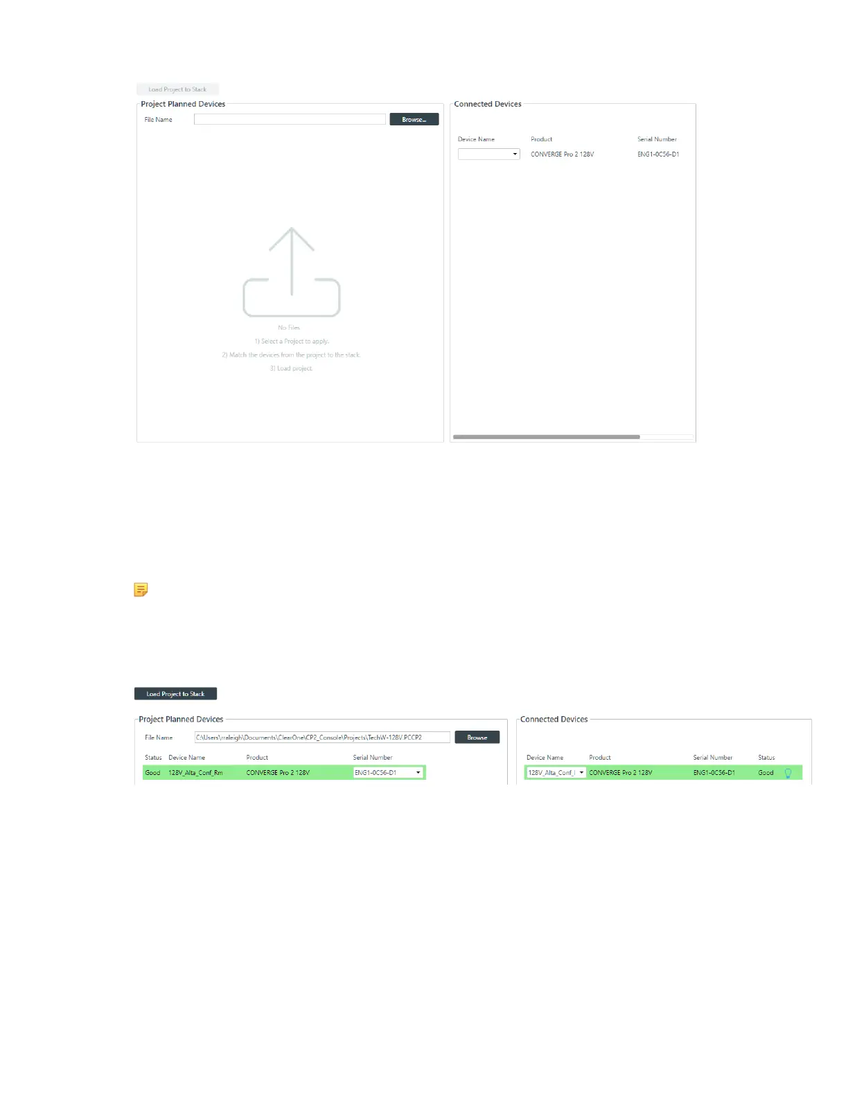 6. Once the project device and the connected device are matched, they both appear highlighted in green: