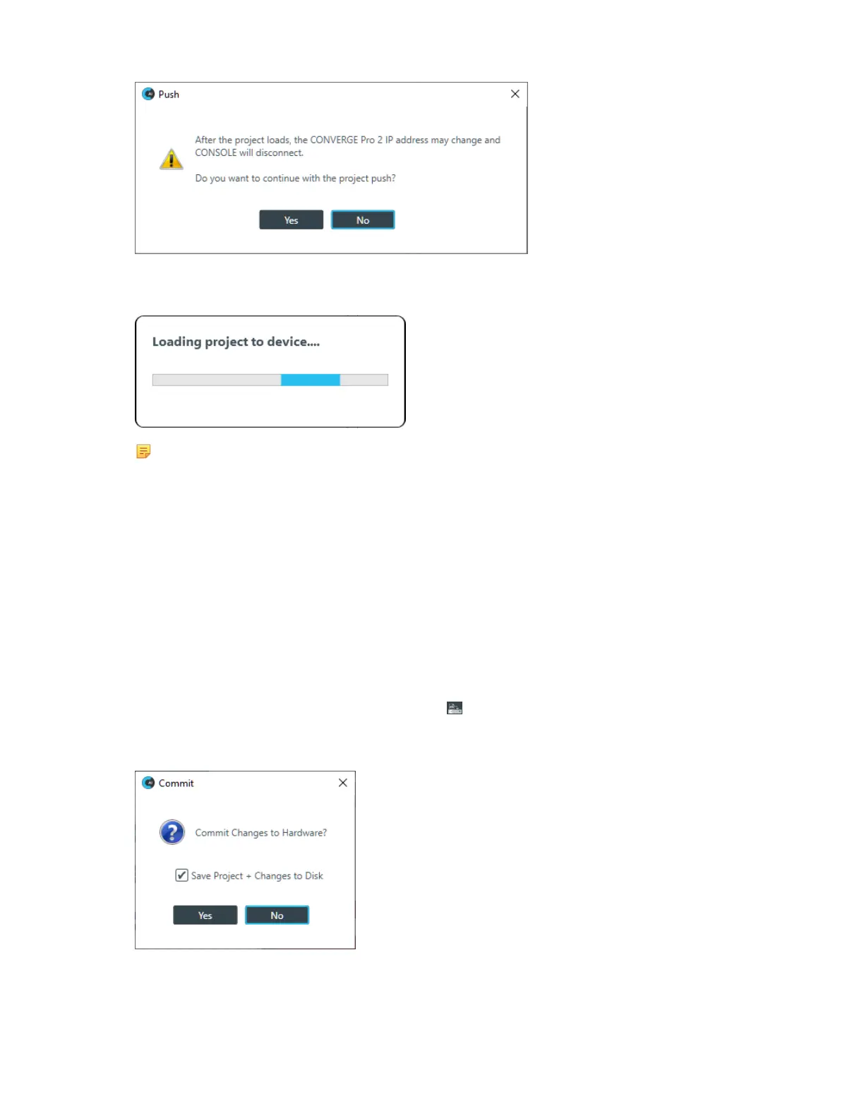 The Loading project to device dialog box closes when the project has been loaded to the device.