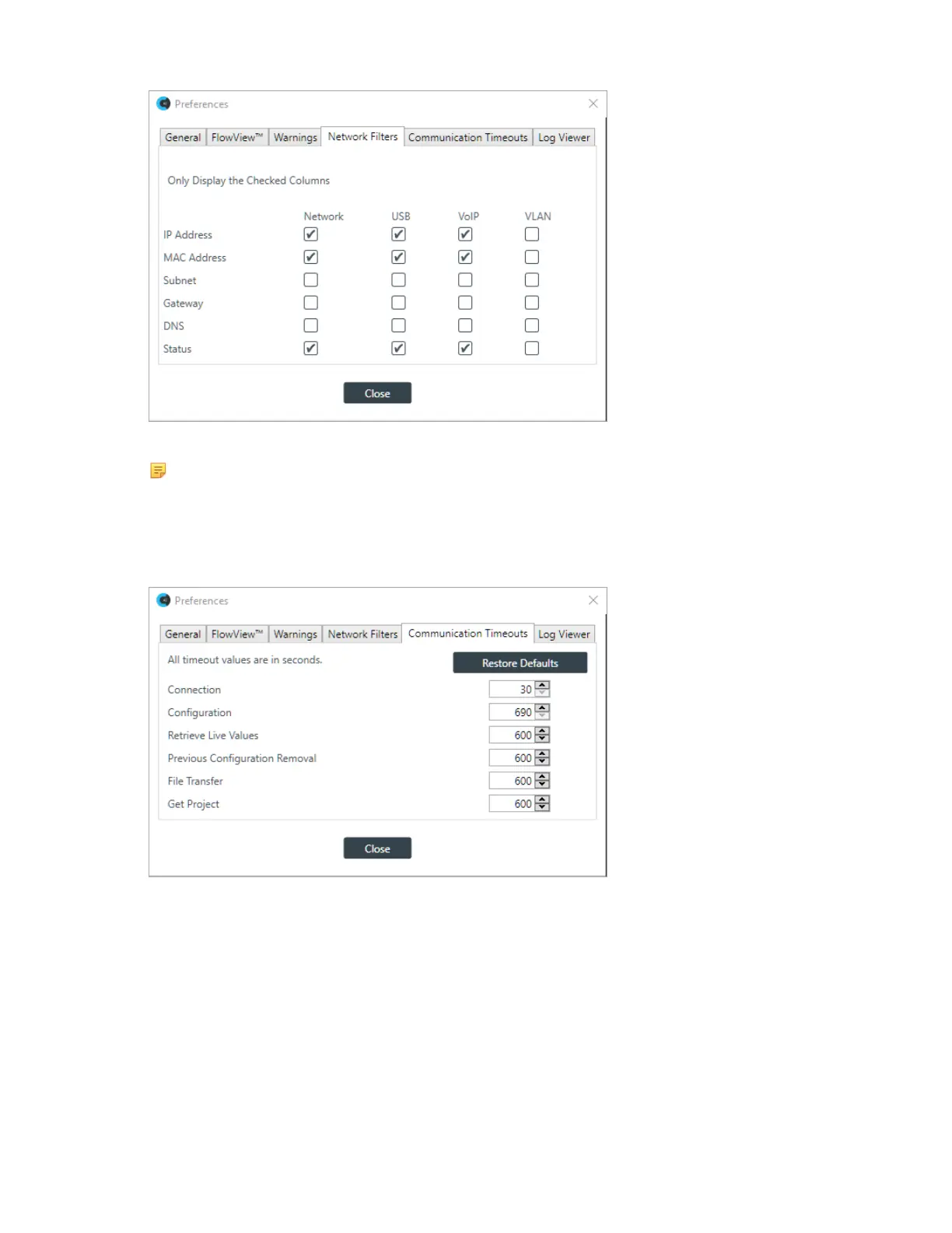 11.Change any of the communication timeout values, or click Restore Defaults to change all timeouts to