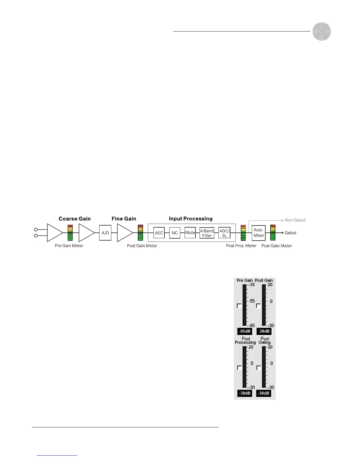 Pre Gain meter indicates the input’s level before gain adjustments. Meter range is