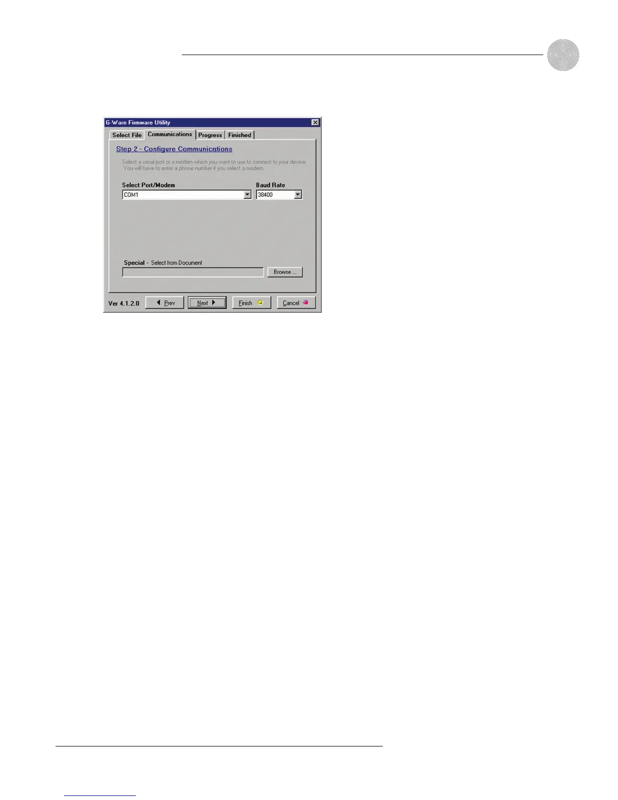 5. Select the PC COM port you are using for the upgrade. Select the Baud