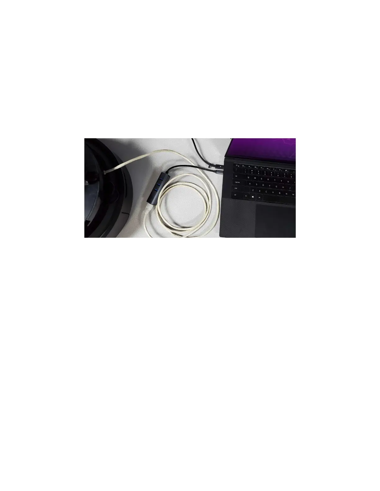 using an ethernet cable. You may need a USB to Ethernet adapter for your PC.