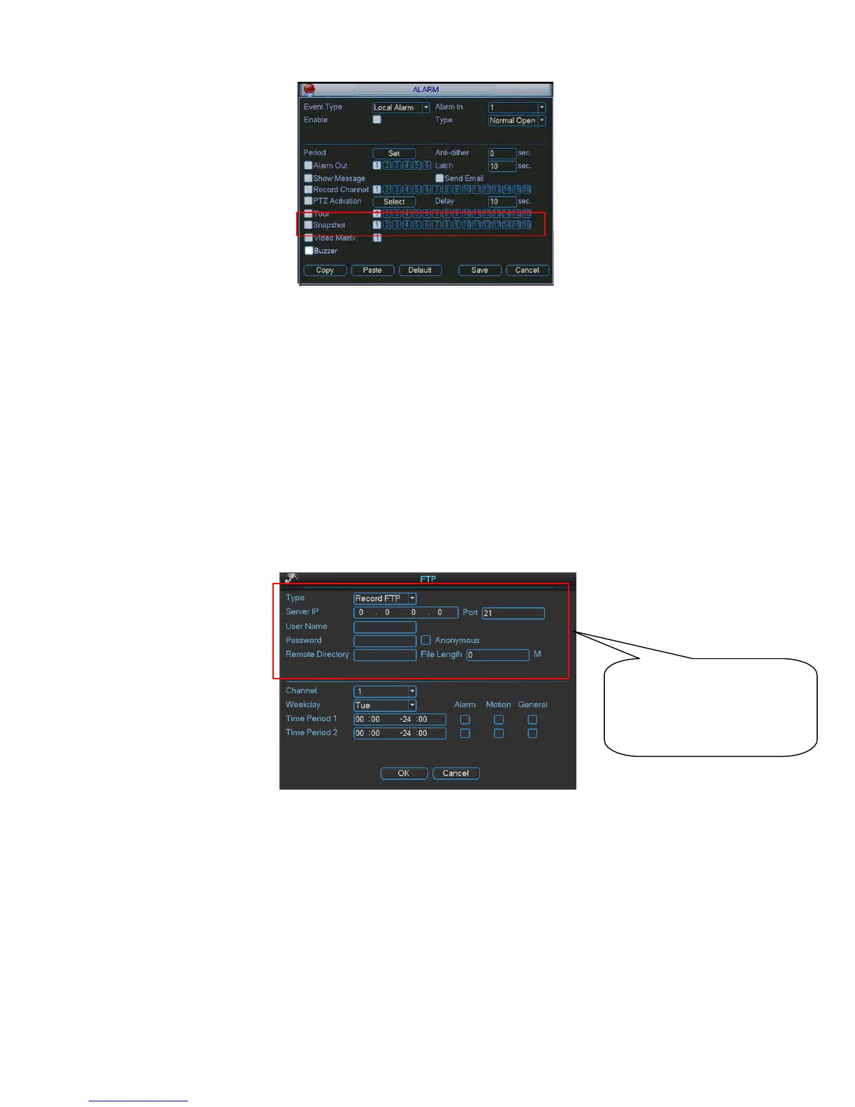 In Network interface, you can set FTP server information. Please enable FTP function and