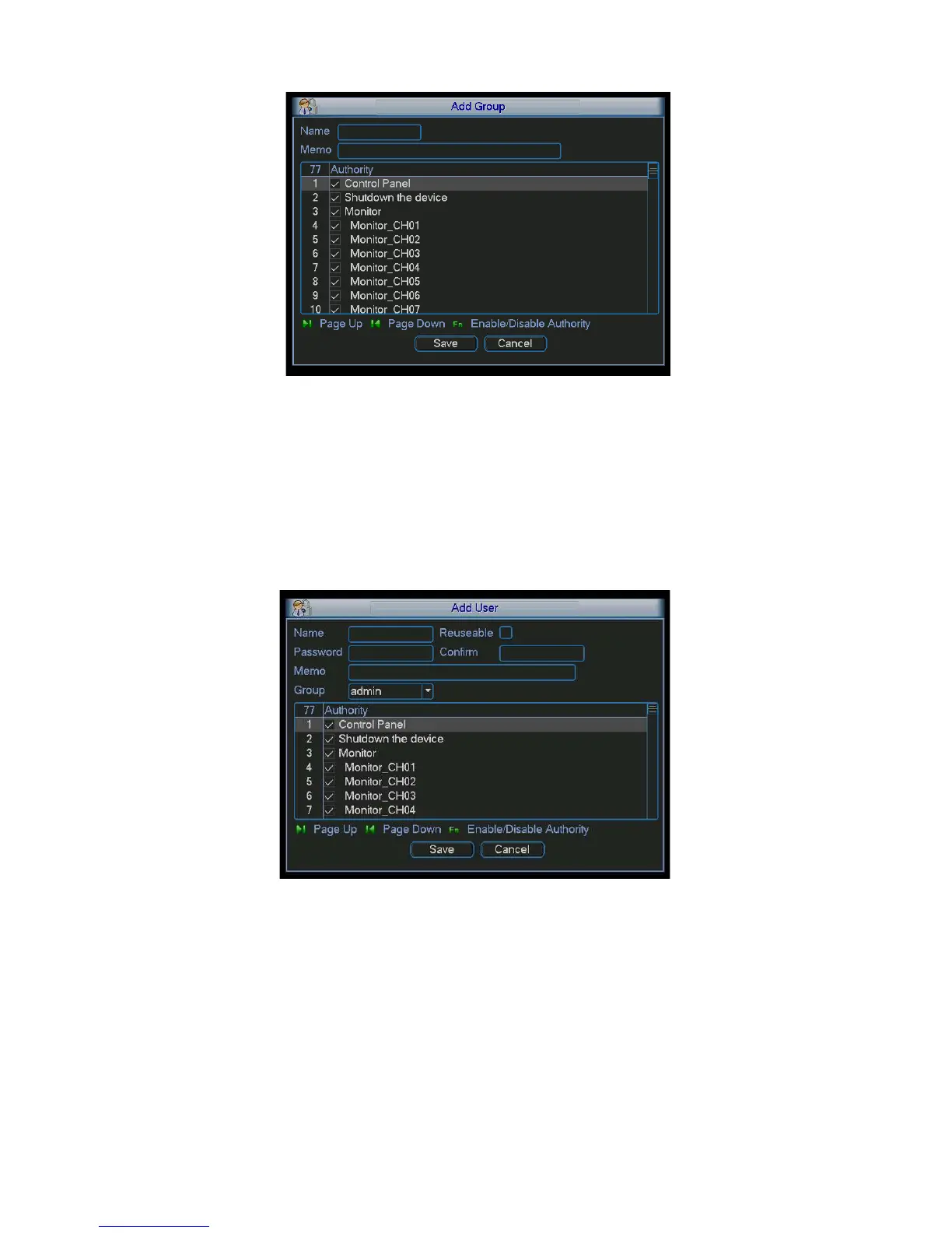 Please input the user name, password, select the group it belongs to from the dropdown list.