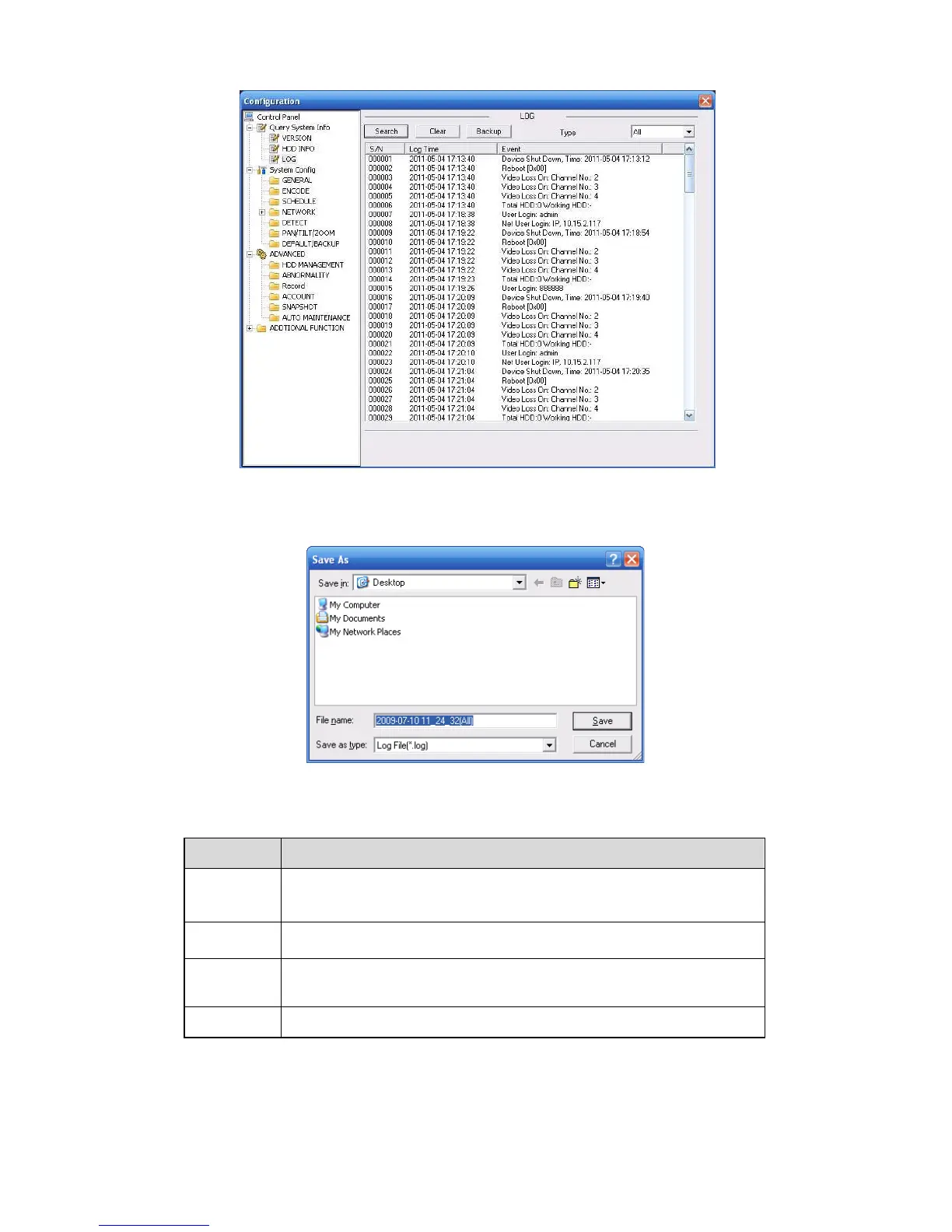 Clear You can click this button to delete all displayed log files. Please note