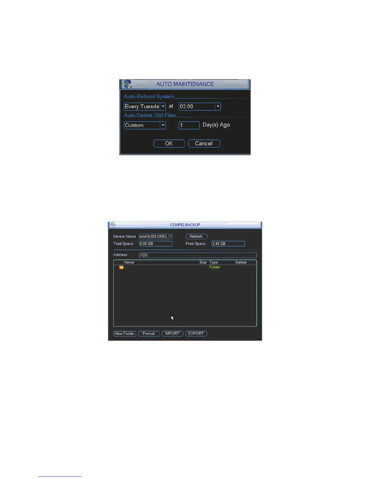 Here you can set auto-reboot time and auto-delete old files setup. You can set to delete the files