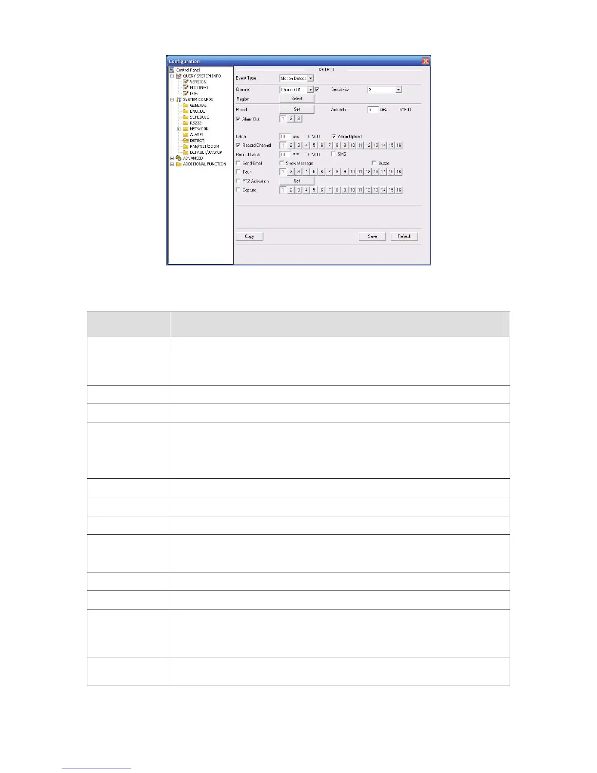 Select a channel from the dropdown list to set motion detect, video loss and vid