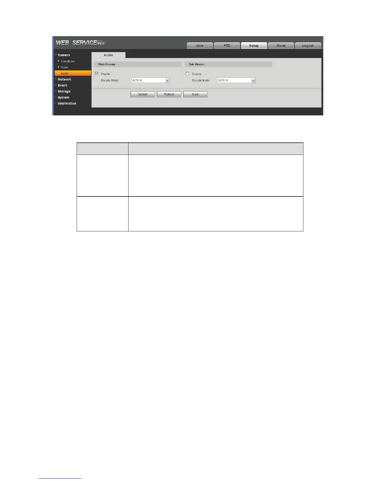 Audio enable Main stream: Recorded file only contains video by default. You
